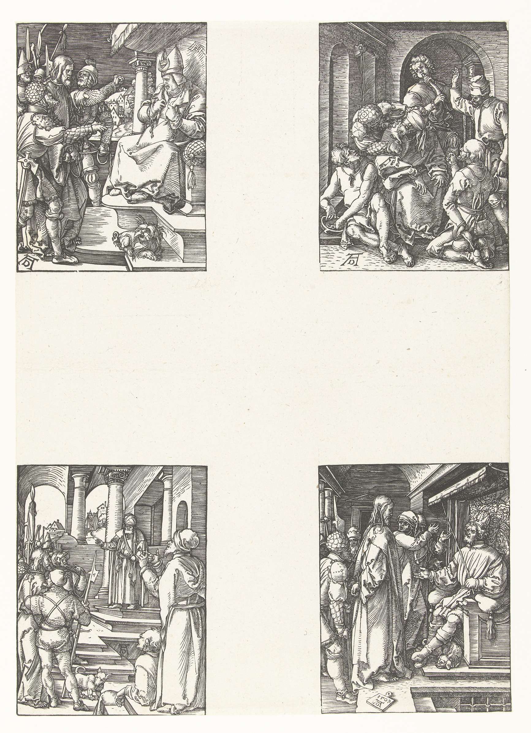 De vierde reeks van vier scènes uit de prentserie 'De kleine Passie', hier nog onversneden met 4 afbeeldingen op 1 blad. Linksboven: Christus wordt door gewapende mannen voor Kajafas geleid. Rechtsboven: Christus wordt lastig gevallen en bespot door vijf mannen. Linksonder: Christus wordt door gewapende mannen voor Pilatus geleid. Rechtsonder: Christus wordt door gewapende mannen ...