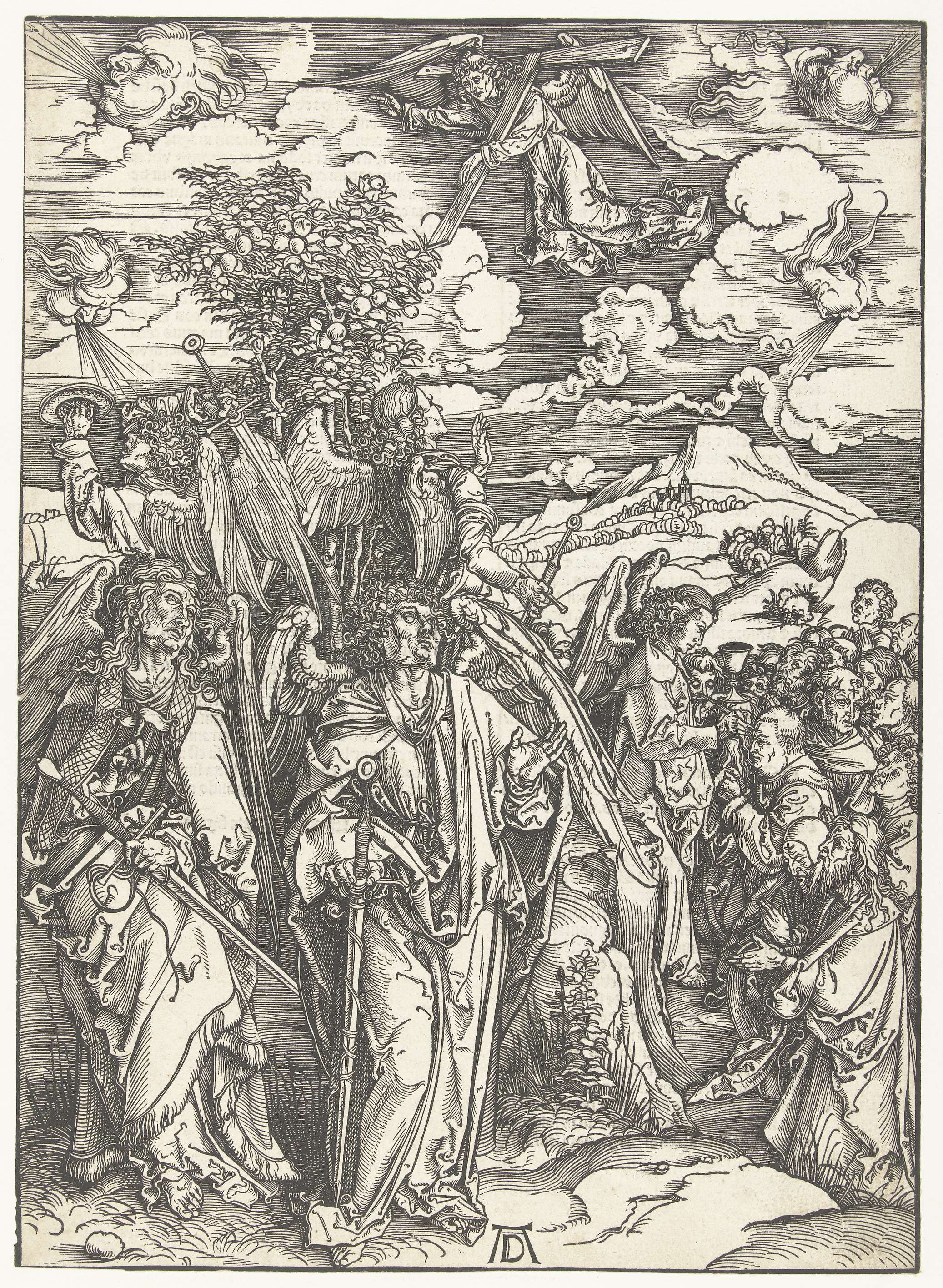 Vier engelen, linksonder, houden vier winden (in de vorm van vier blazende kopjes) tegen, terwijl een andere engel bij een aantal mensen een kruis op het voorhoofd tekent. Op versozijde Latijnse bijbeltekst in gotisch schrift in twee kolommen.