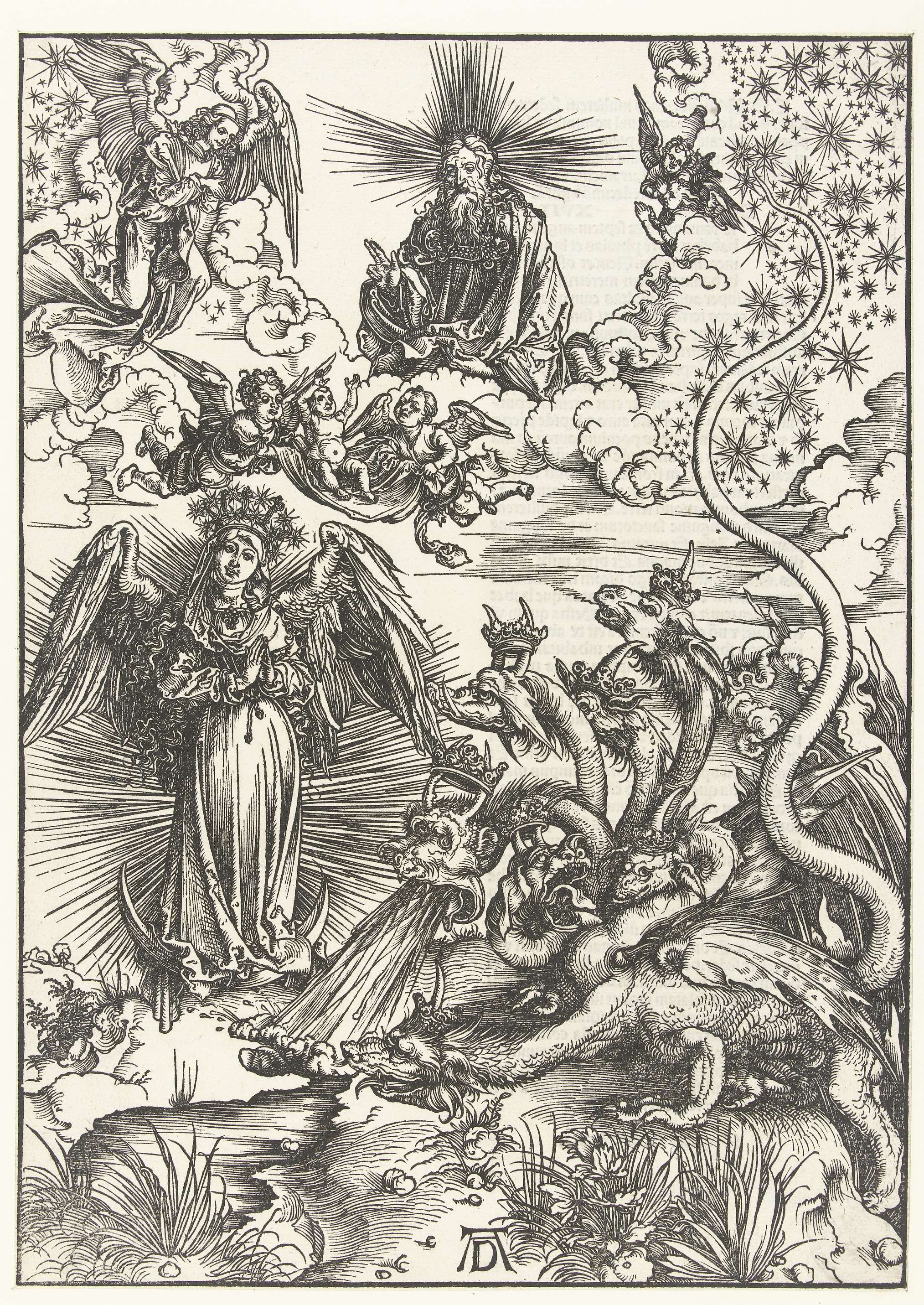 Een gevleugelde vrouw, omgeven door een stralenkrans, staand op een maansikkel en met een sterrenkroon op het hoofd, wordt bedreigd door een zevenkoppige draak. Engelen voeren haar baby veilig naar God in de hemel. Op versozijde één kolom Latijnse bijbeltekst in gotisch schrift.