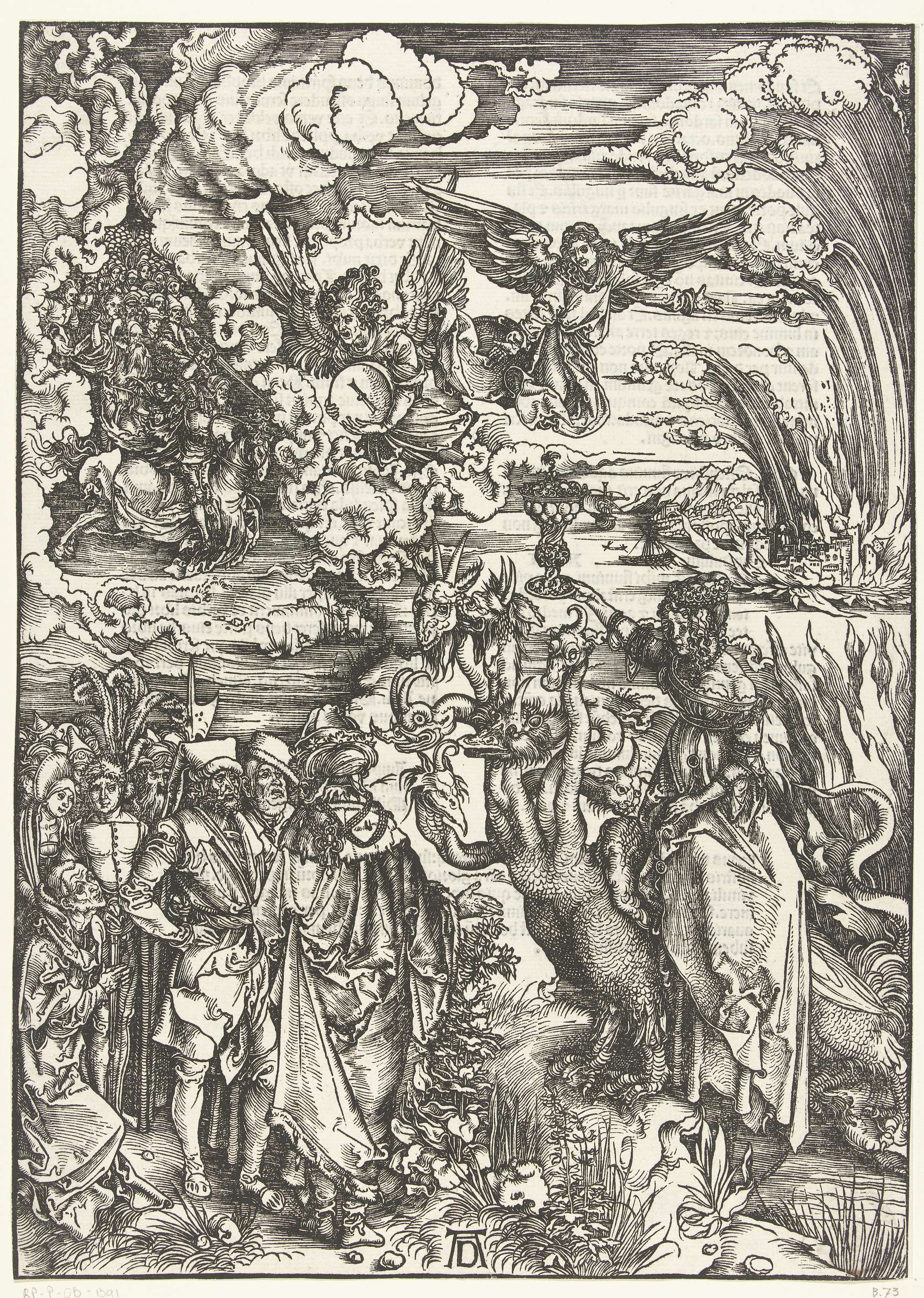 Een mooi geklede en gekapte vrouw rijdt op een beest met zeven koppen en tien horens. Vanuit de hemel verschijnt een leger ruiters. Daarnaast twee engelen, van wie één een molensteen vast heeft. Rechts op de achtergrond is te zien hoe een stad in vlammen opgaat. Op versozijde Latijnse bijbeltekst in gotisch schrift in twee ...