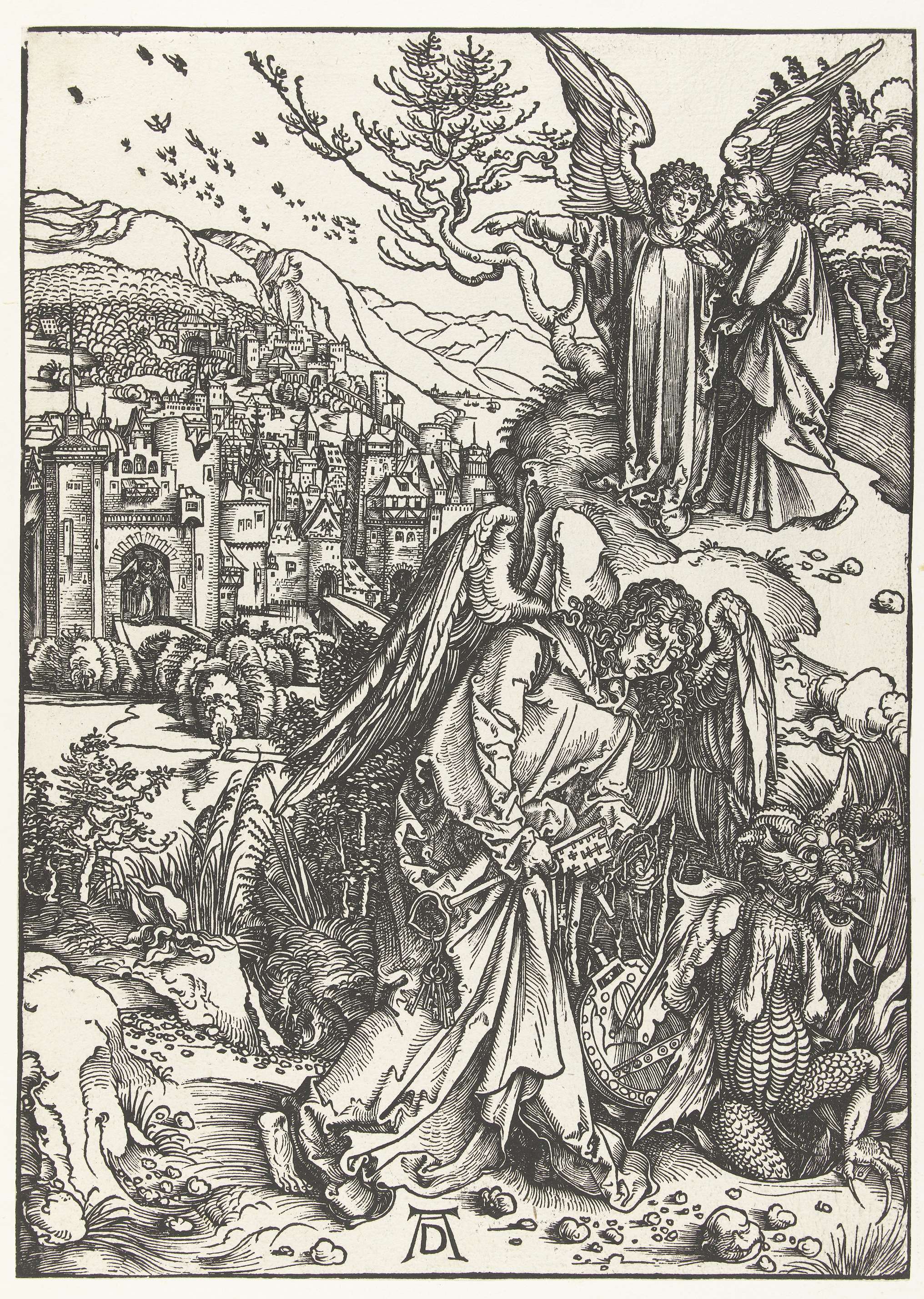 Op de voorgrond laat een engel met een grote sleutel een duivelse draak in een put verdwijnen. Rechts op het middenplan toont een engel aan Johannes de Evangelist vanaf een bergtop het nieuwe Jeruzalem, dat links op de achtergrond te zien is.
