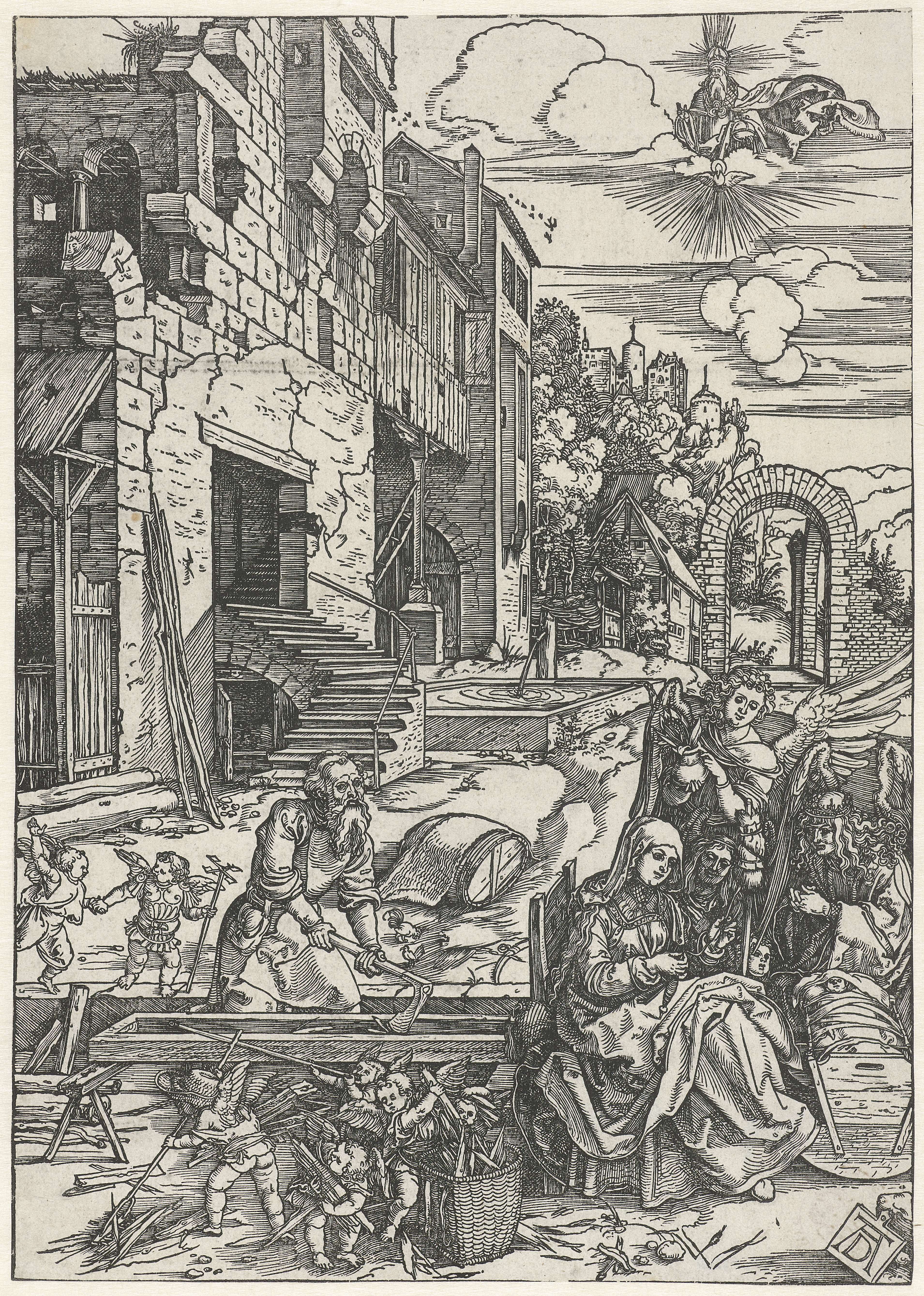 Voor een vervallen gebouw zit Maria naast enkele engelen te spinnen, terwijl ze met de voet het bedje waarin het Christuskind ligt laat wiegen. Achter haar werkt Jozef aan een trog, geholpen door putti. Deze prent is onderdeel van een serie van 20 prenten, bestaand uit een titelprent en 19 prenten met scènes uit het ...