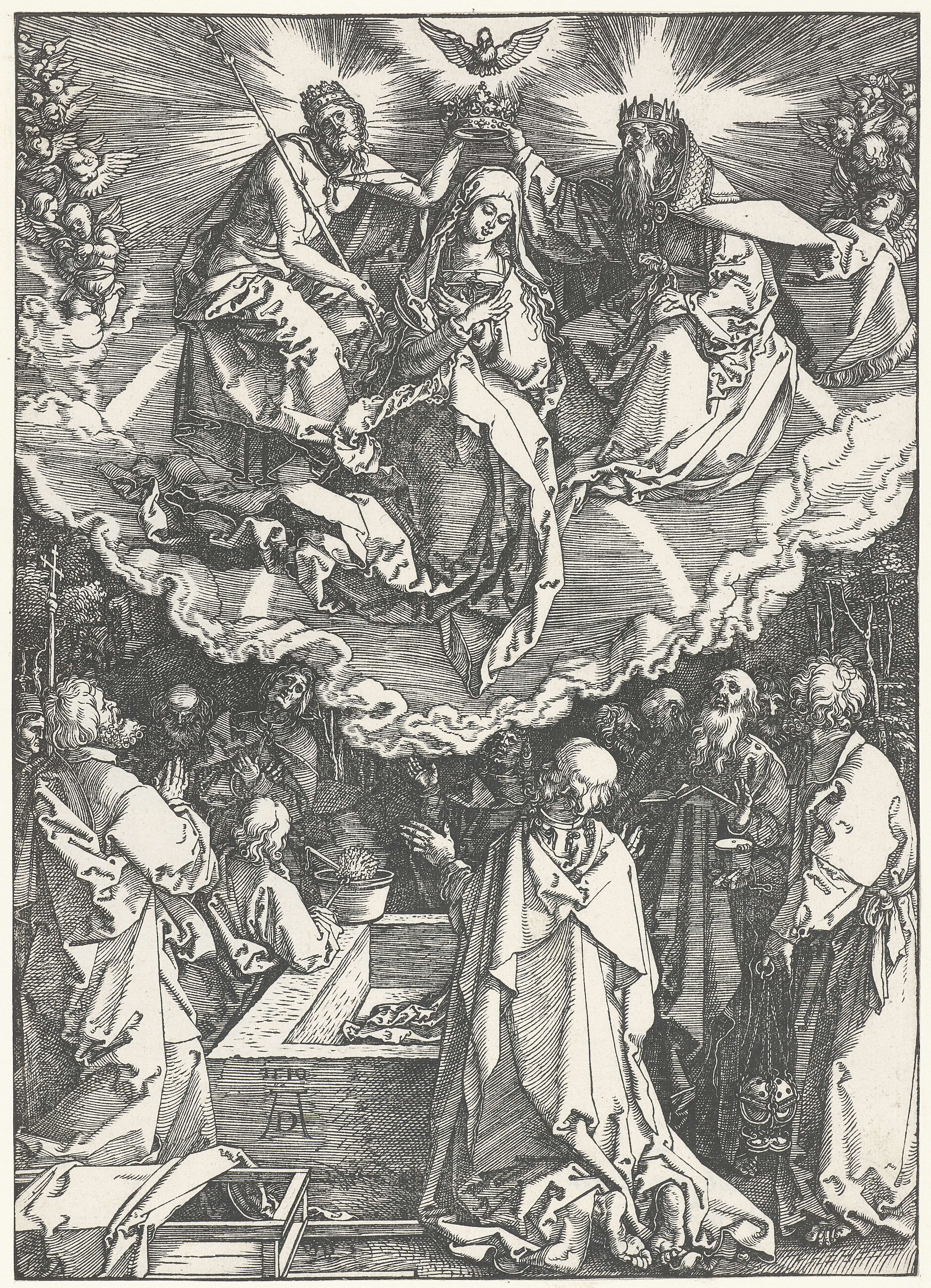 De apostelen staan om een leeg graf en kijken omhoog, waar Maria in de hemel door Christus en God wordt gekroond. Deze prent is onderdeel van een serie van 20 prenten, bestaand uit een titelprent en 19 prenten met scènes uit het leven van Maria.