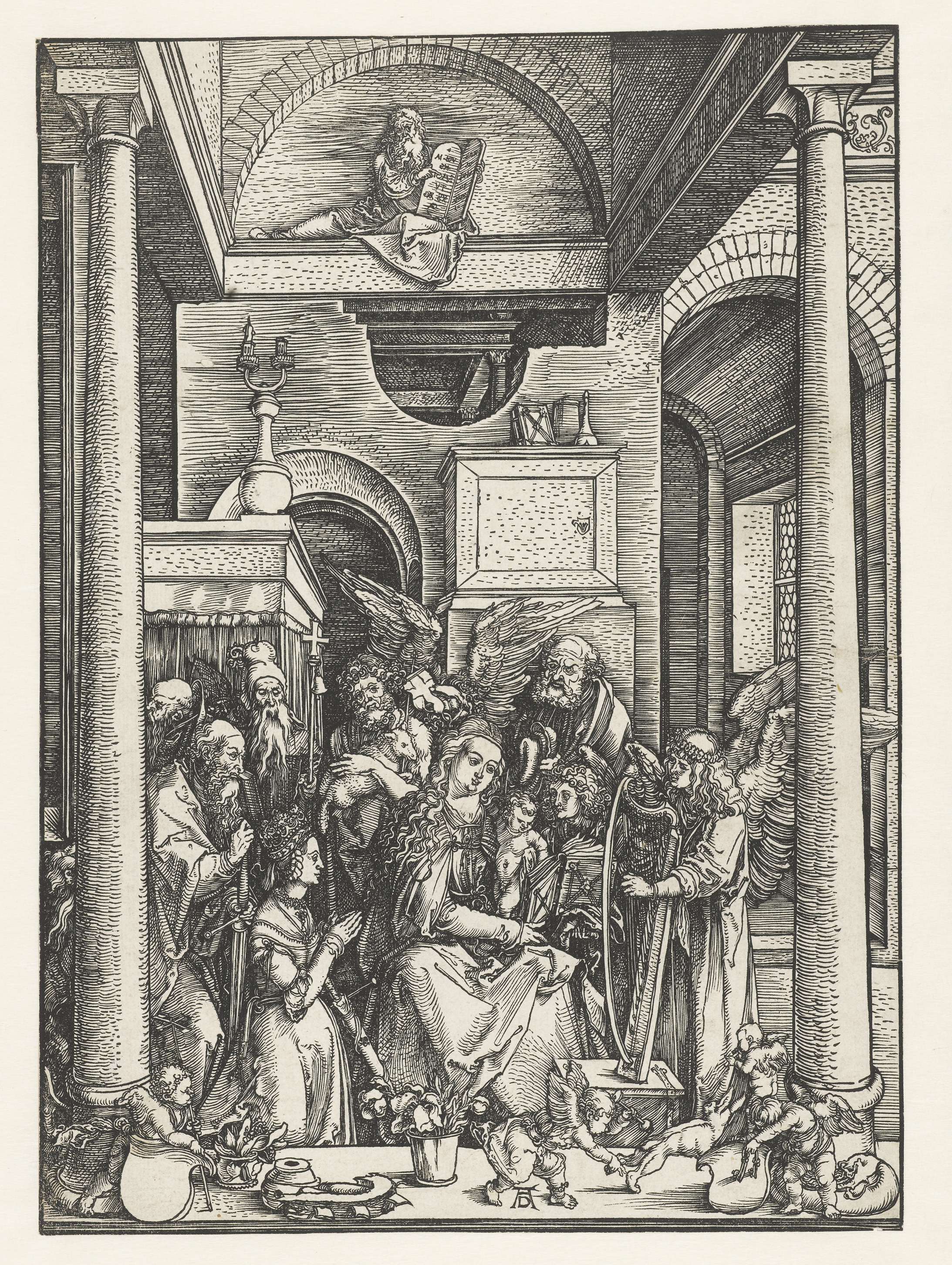 Maria zit in een vertrek met het Christuskind op schoot, omringd door engelen en heiligen (Jozef, Catharina, Johannes de Doper, Hiëronymus, Antonius, Paulus en - hoewel niet helemaal zeker - Augustinus). Deze prent is onderdeel van een serie van 20 prenten, bestaand uit een titelprent en 19 prenten met scènes uit het leven van Maria.