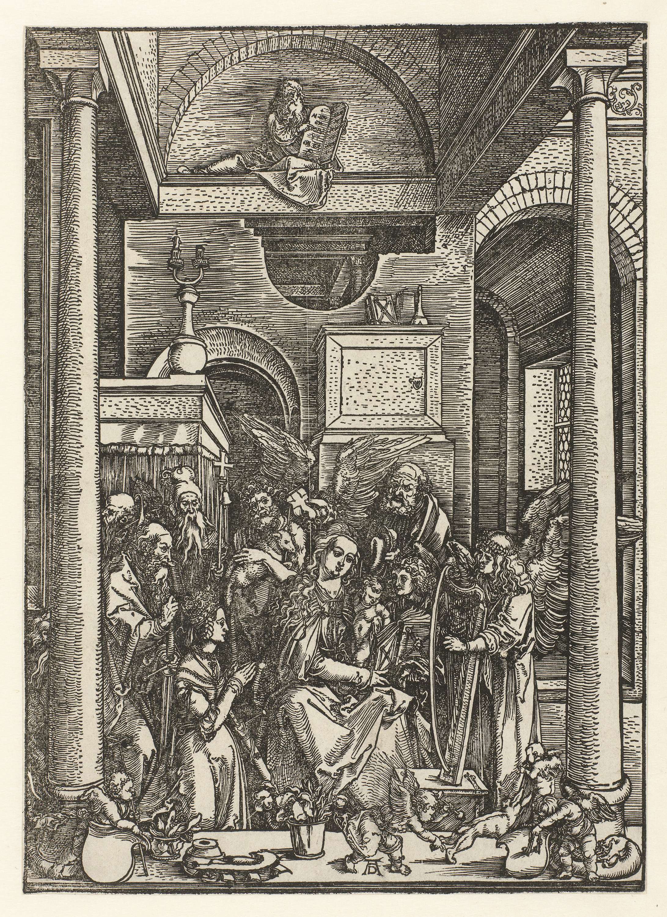 Maria zit in een vertrek met het Christuskind op schoot, omringd door engelen en heiligen (Jozef, Catharina, Johannes de Doper, Hiëronymus, Antonius, Paulus en - hoewel niet helemaal zeker - Augustinus). Deze prent is onderdeel van een serie van 20 prenten, bestaand uit een titelprent en 19 prenten met scènes uit het leven van Maria.