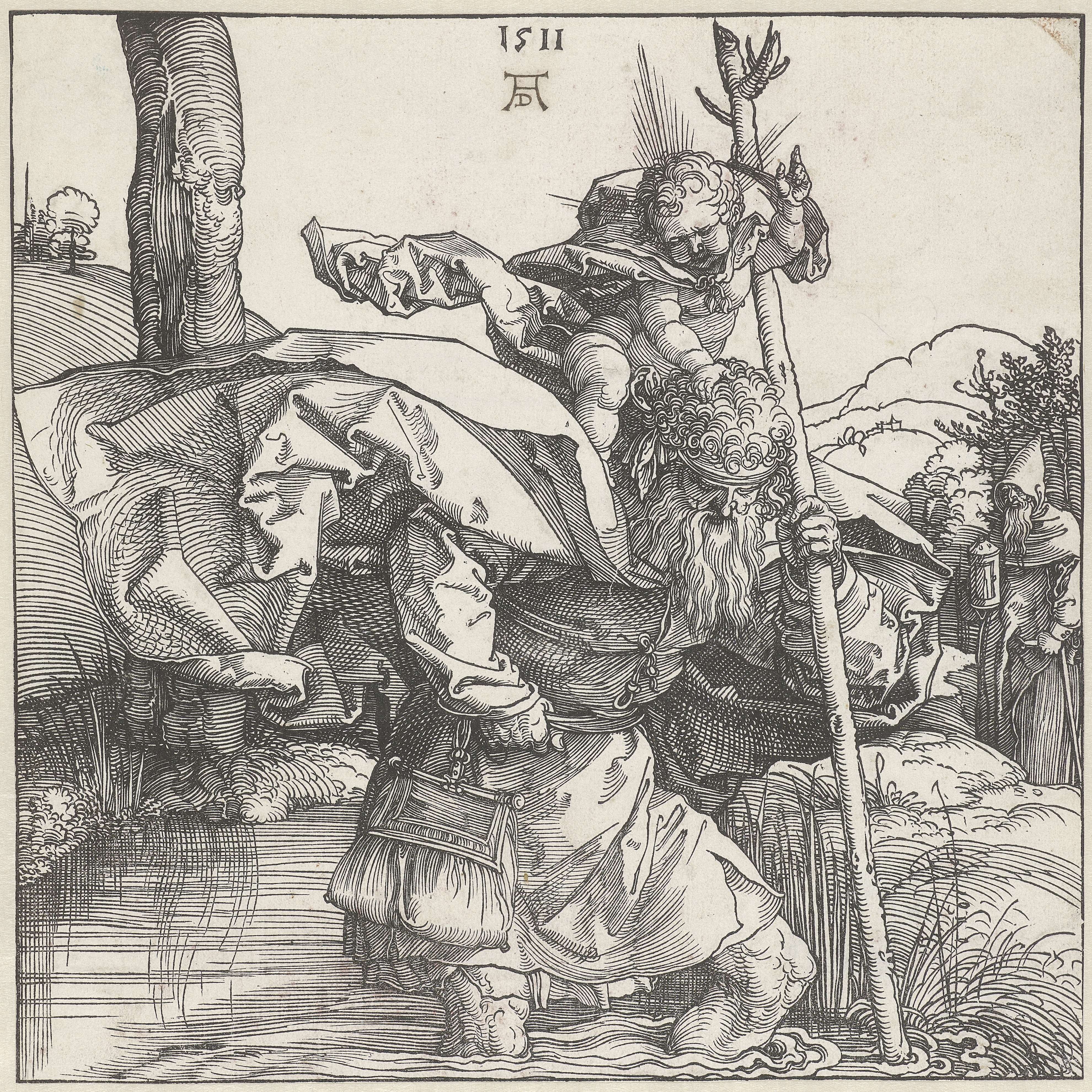 De Heilige Christoffel waadt door een rivier met een stok in zijn linkerhand en het Christuskind op zijn schouders. Aan de oever staat een kluizenaar met een lamp.