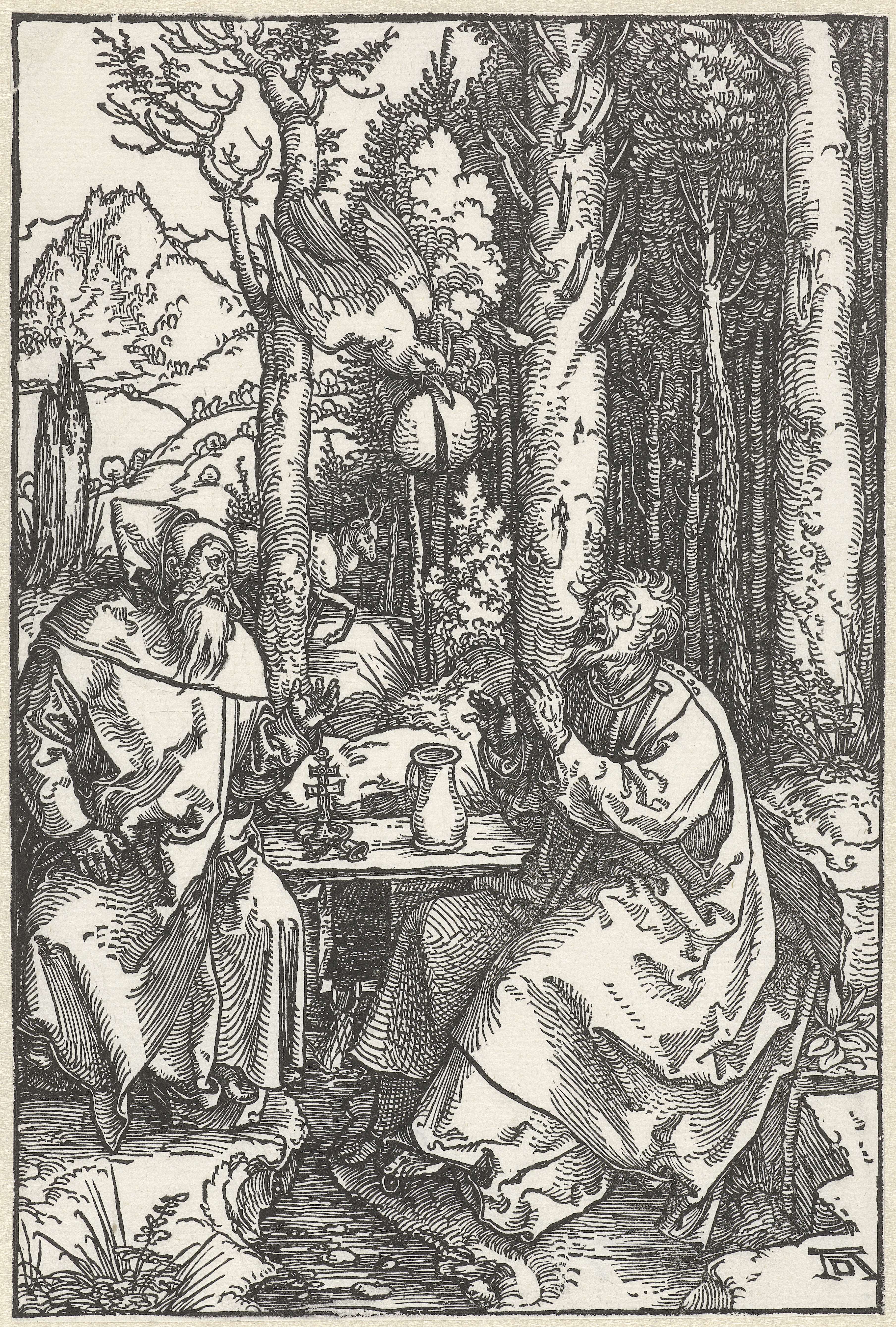 De Heilige Antonius zit met Paulus de Kluizenaar aan een tafeltje in een bos. Een raaf komt aanvliegen met brood in de snavel.