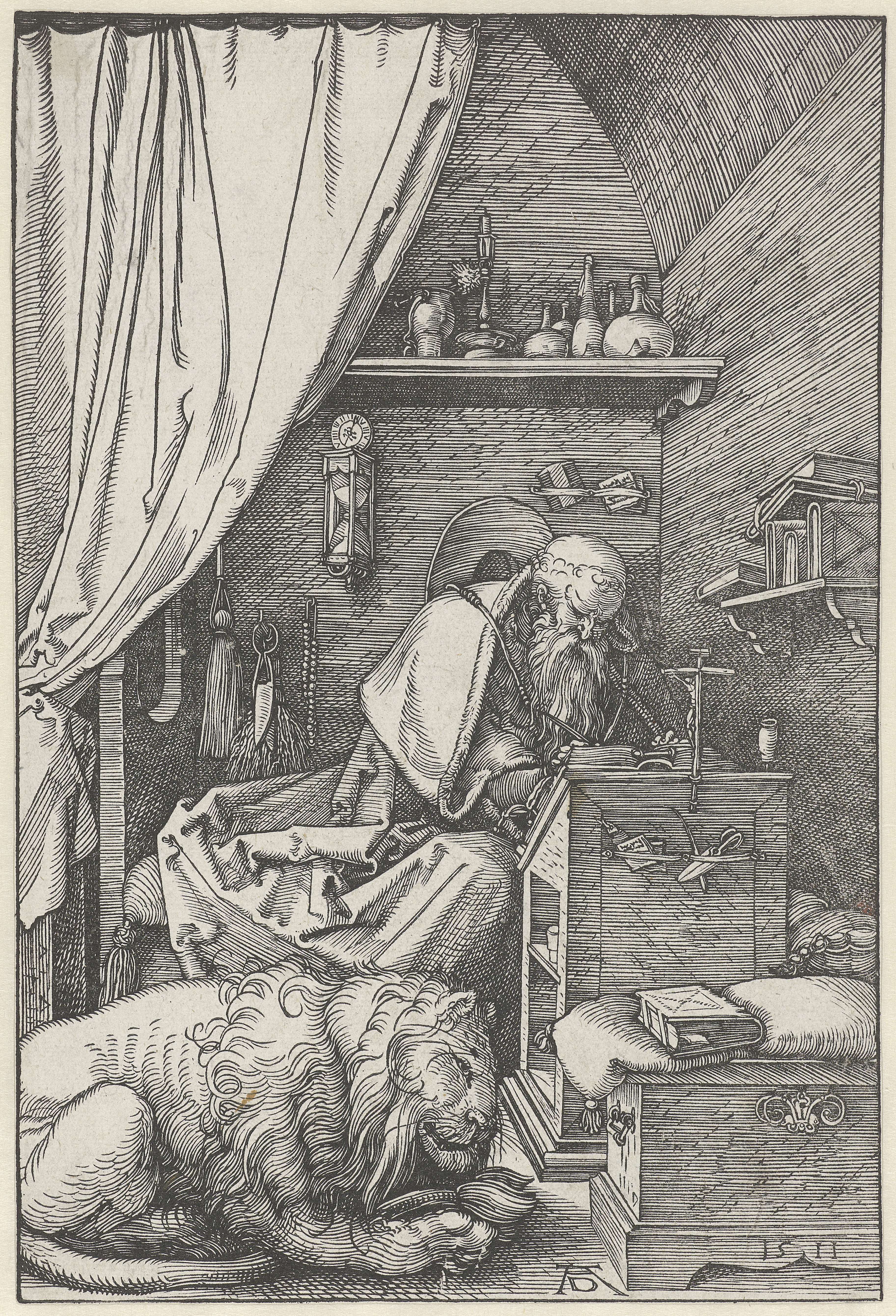De Heilige Hiëronymus zit in een studeervertrek te schrijven aan een lezenaar bij een gordijn. Op de voorgrond ligt een leeuw.