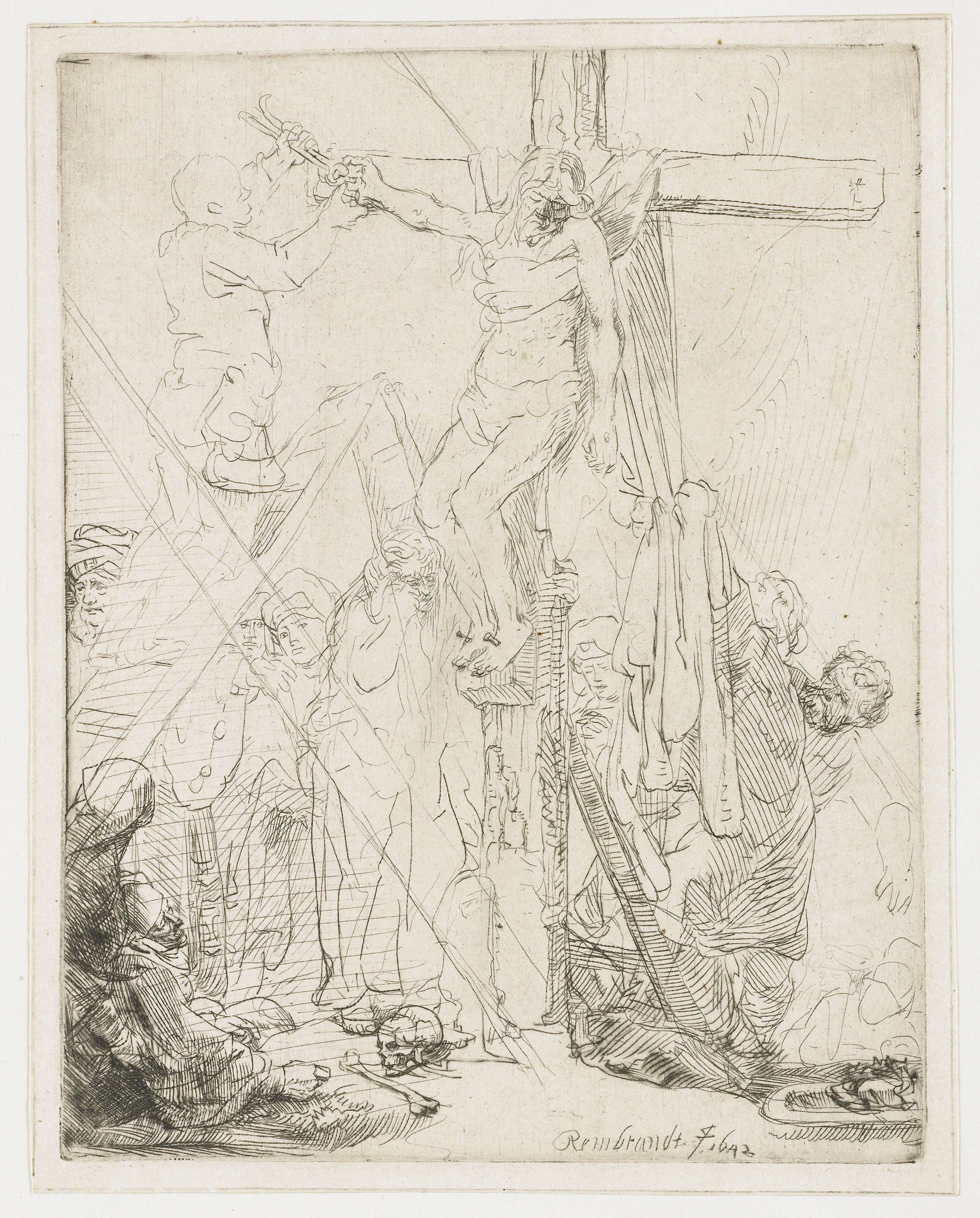 Dit is een totaal andere vertolking van de Kruisafname. De meeste figuren zijn nauwelijks meer dan omtreklijnen. Bij Rembrandt is de scheidslijn tussen licht geëtst en onvoltooid niet altijd helder, maar deze prent lijkt toch in de laatste categorie te vallen. Zelf schijnt hij daarover gezegd te hebben dat een kunststuk voltooid is als de ...