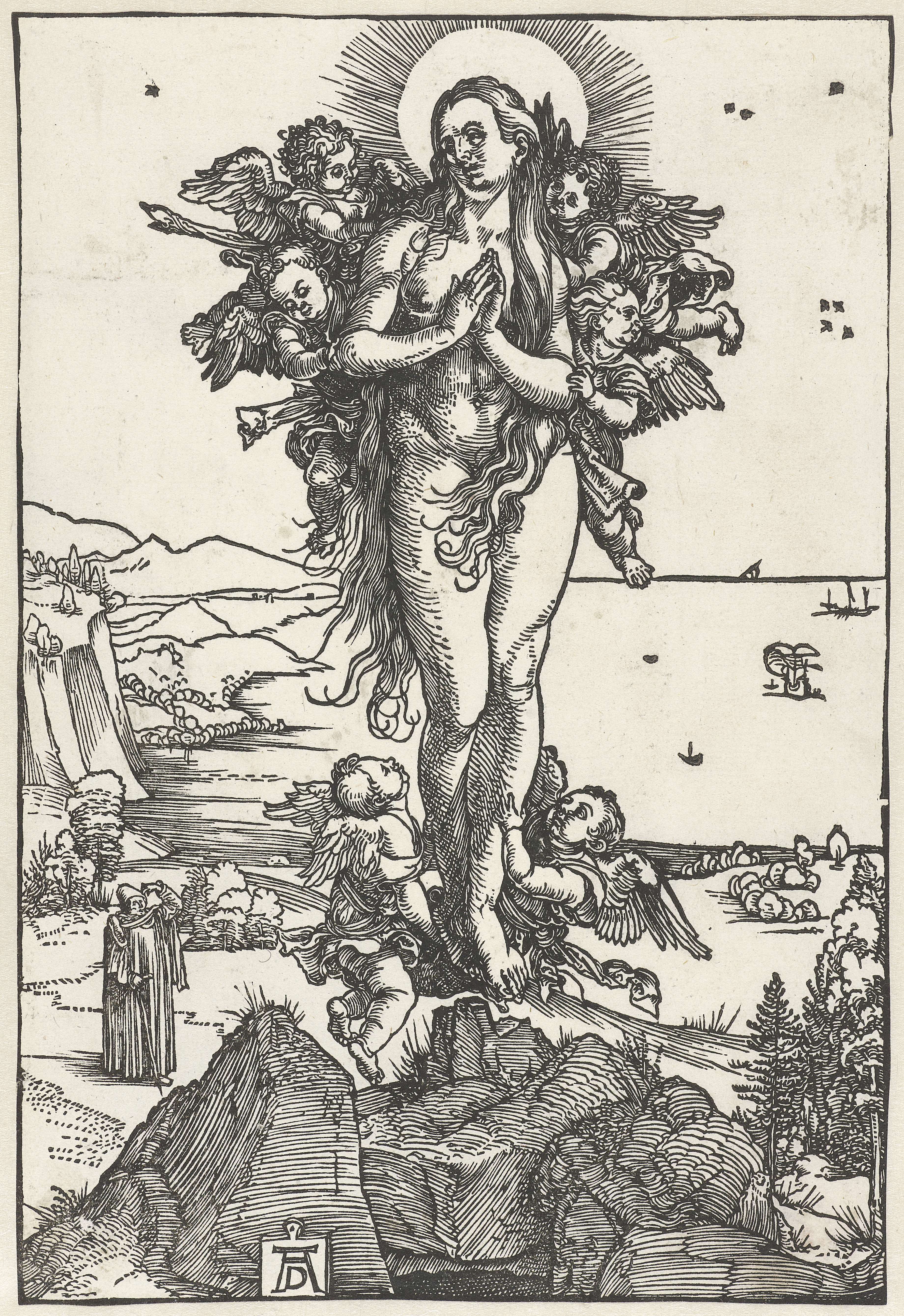 Maria Magdalena wordt door engeltjes boven een kustlandschap gedragen. Op de achtergrond links een man die naar haar kijkt.