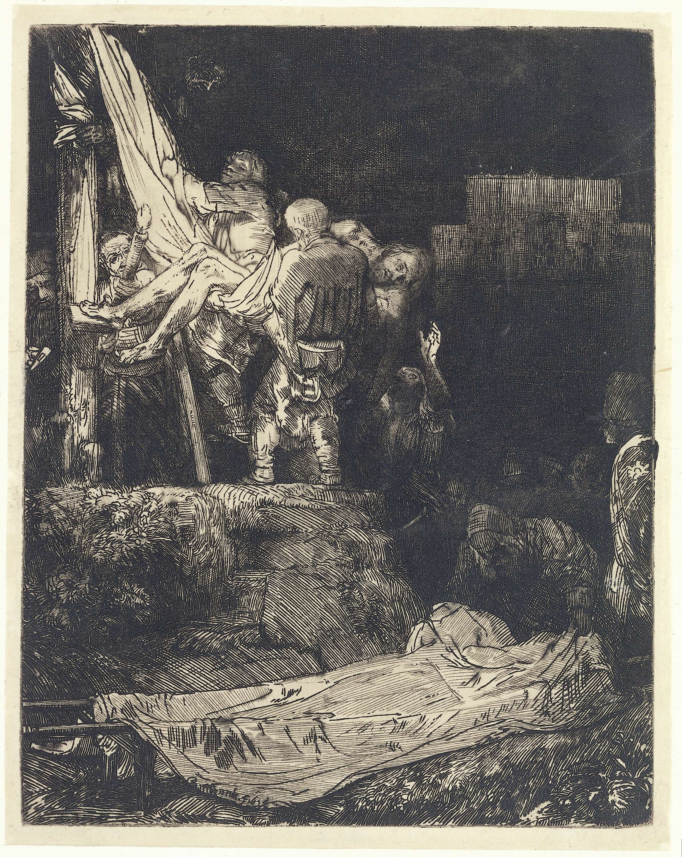 Rembrandt toont alleen de voet van het kruis met de mannen die Jezus voorzichtig omlaag brengen. Ze lijken doodstil. Onder de ladder licht iemand ze bij met een fakkel, de enige lichtbron in de voorstelling. Direct rond de vlam is alles helverlicht, maar iets verder weg verdwijnen de details al snel in het duister van ...