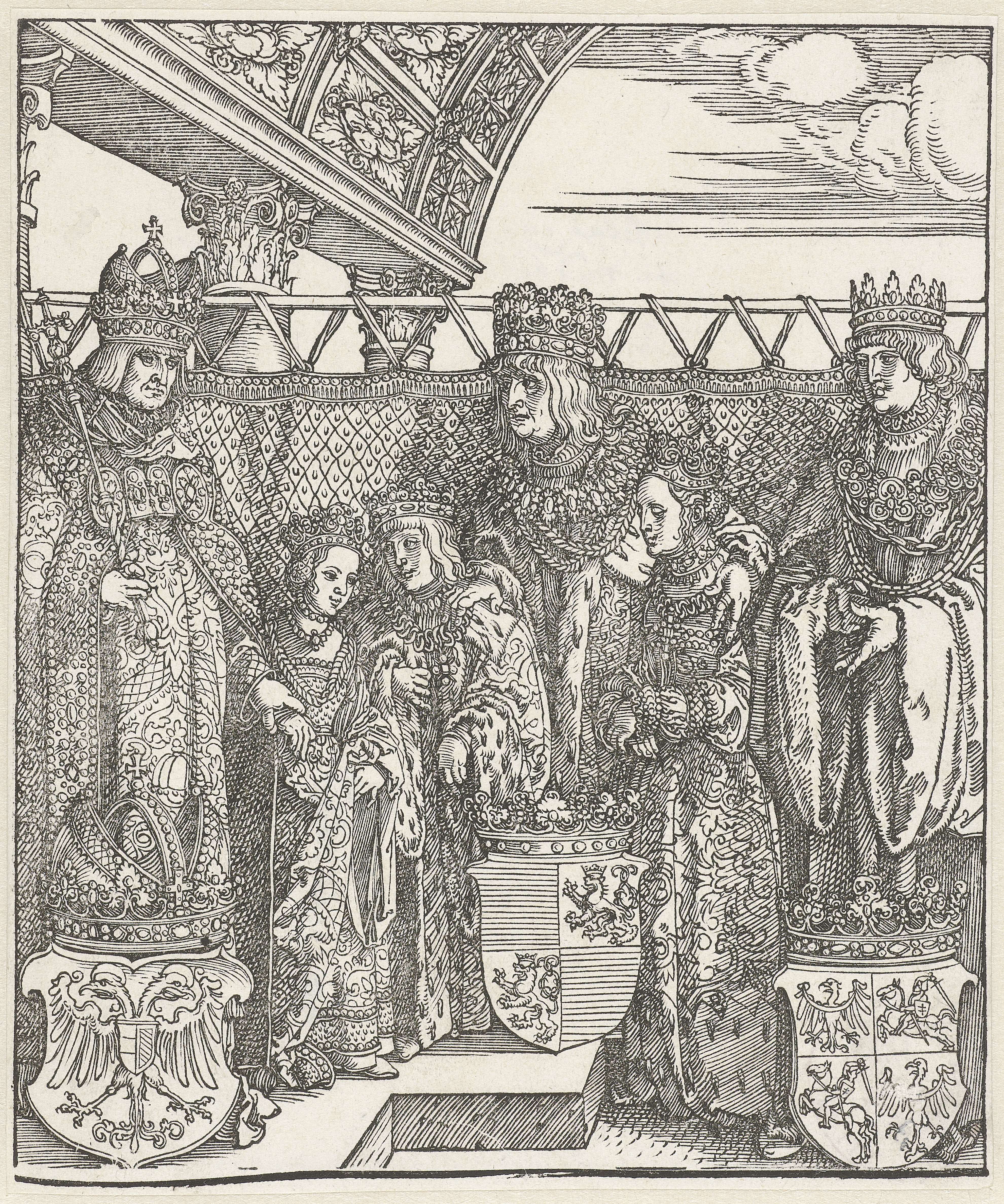 Voor een gordijn staat Maximiliaan met de koning van Hongarije (Vladislav) en zijn broer (Sigismund). Tussen hen in twee jonge meisjes (Maria en Anna) en één jongetje (Ferdinand of Lodewijk). Bij hun voeten drie wapenschilden. Detail van de triomfboog van keizer Maximiliaan I.