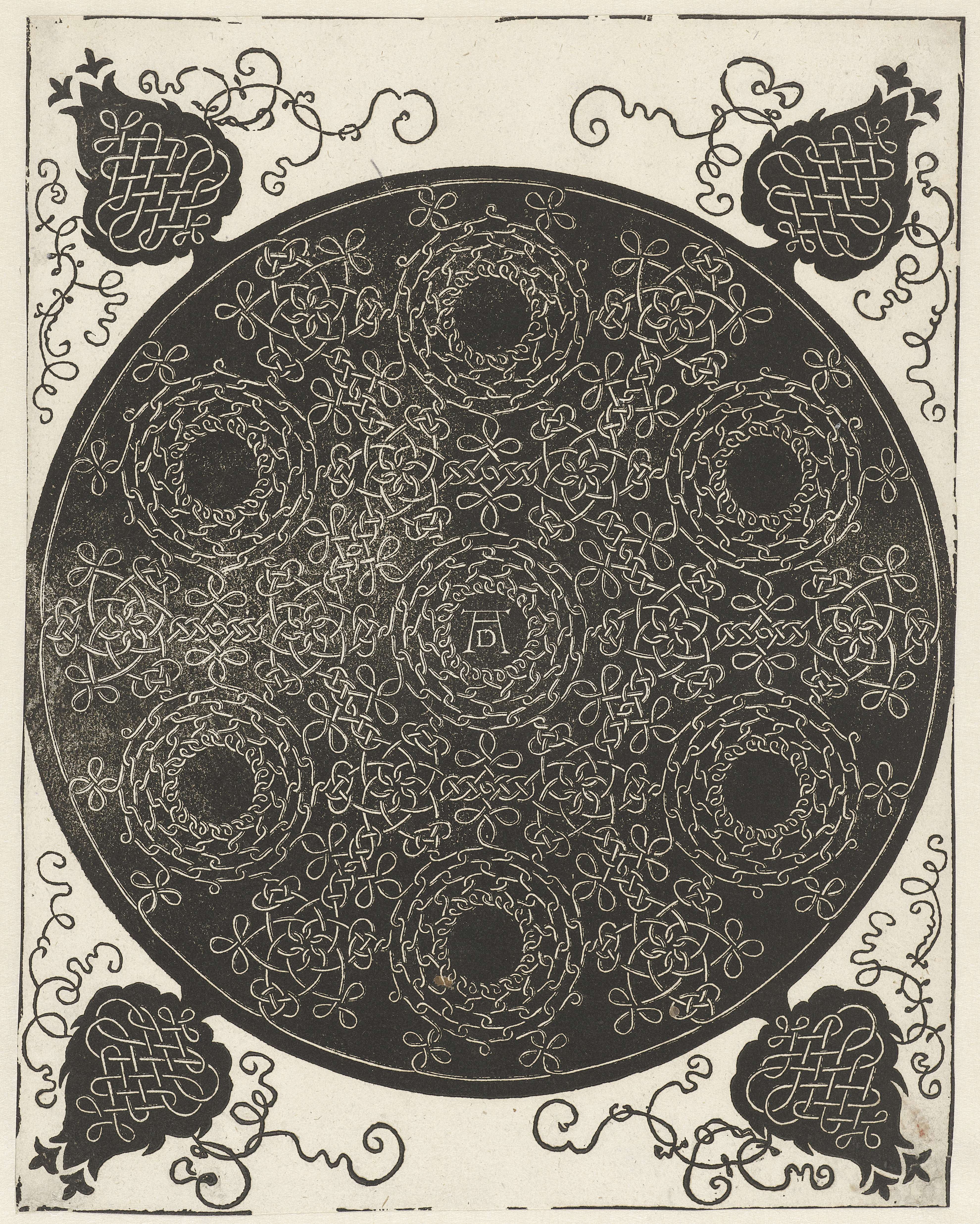 Zwarte schijf met vier uitstulpingen, gevuld met witte moresken, o.a. in de vorm van zeven kransen. Deze prent is onderdeel van een reeks van 6 ornamentprenten met moresken.