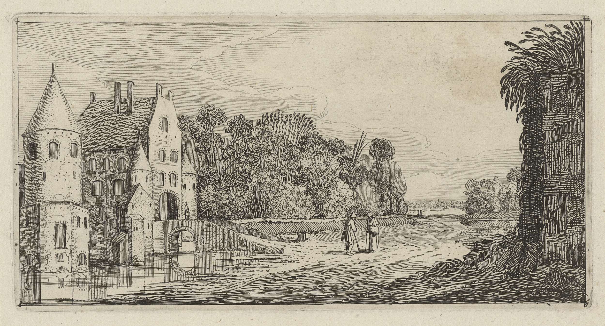 Gezicht op een kasteel aan een kanaal. Op de weg naast het kanaal voeren twee figuren een gesprek. De prent maakt deel uit van een serie bestaande uit acht vlakke landschappen.