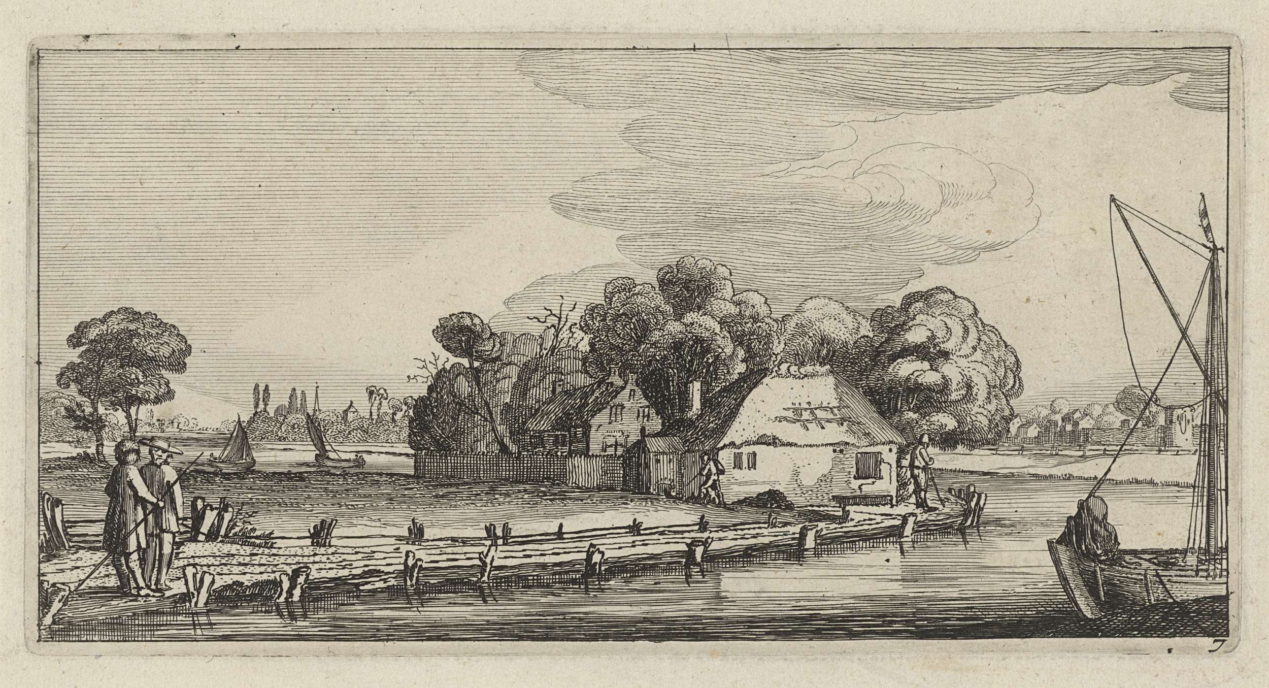Gezicht op een boerderij aan een kanaal, met zeilschepen. Op de weg naast het kanaal staan twee figuren die met elkaar in gesprek zijn. De prent maakt deel uit van een serie bestaande uit acht vlakke landschappen.
