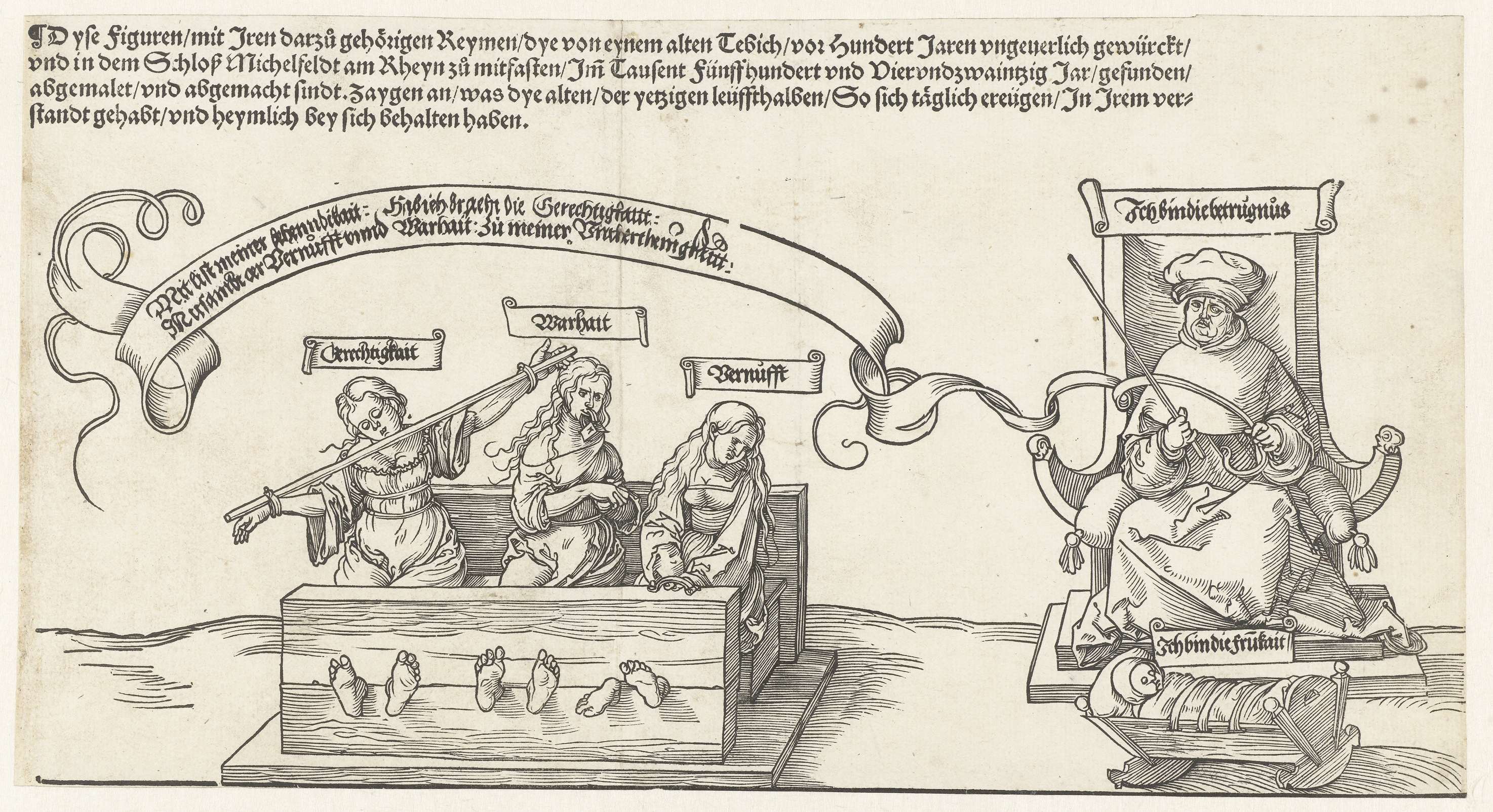 Het middendeel (de tweede twee blokken van de zes) van een brede houtsnede, die ofwel het voorbeeld is geweest voor, ofwel een kopie is van de voorstelling op een wandtapijt uit Slot Michelfeld aan de Rijn. Links drie geketende jongedames, die Gerechtigheid, Waarheid en Vernuft verbeelden. Rechts een rechter op een stoel, met een banderol ...