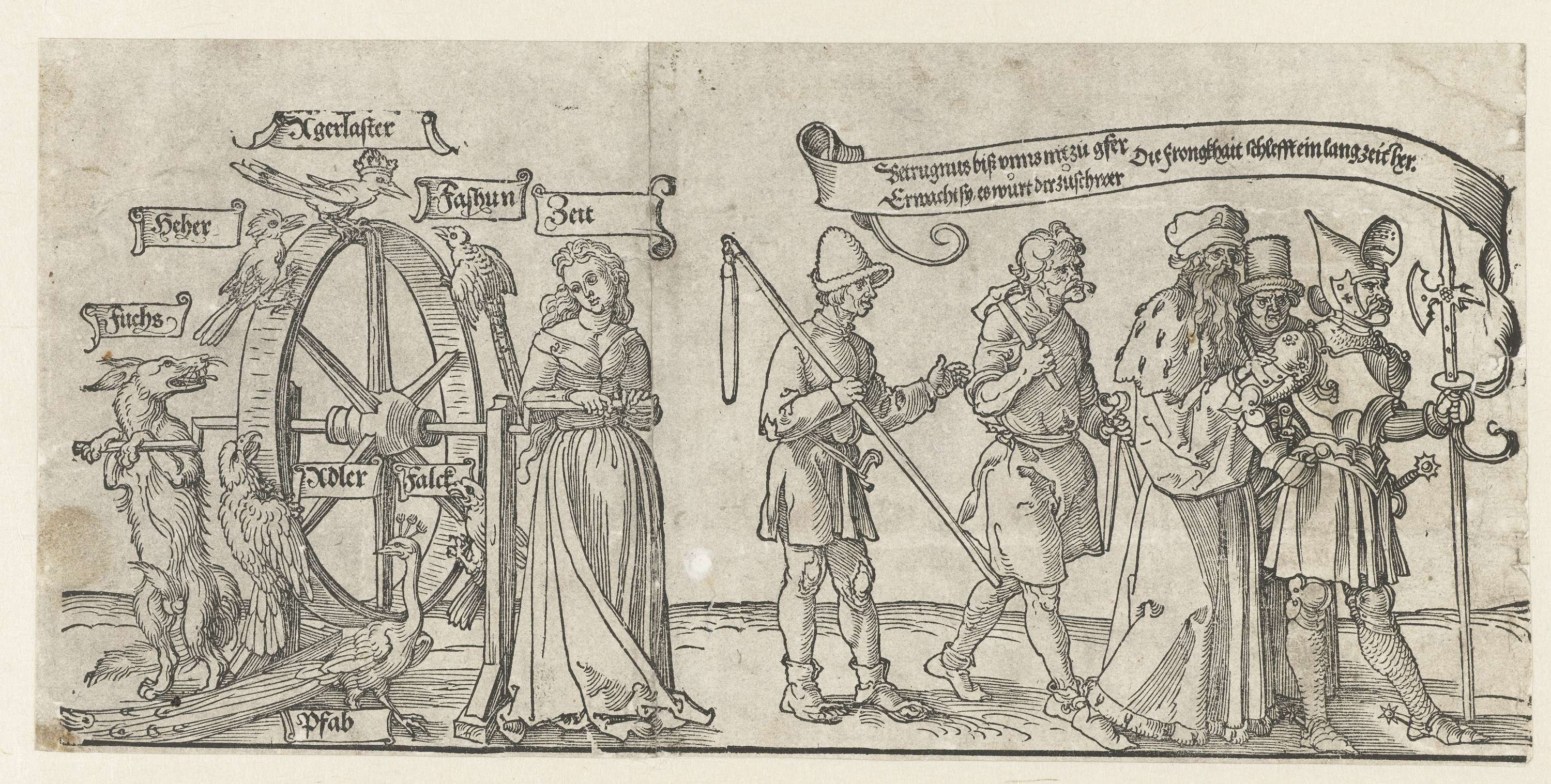 Het linkerdeel (de eerste twee blokken van de zes) van een brede houtsnede, die ofwel het voorbeeld is geweest voor, ofwel een kopie is van de voorstelling op een wandtapijt uit Slot Michelfeld aan de Rijn. Links het rad van fortuin, bewogen door enerzijds een vos en anderzijds een jongedame die Tijd verbeeldt. Rechts een ...