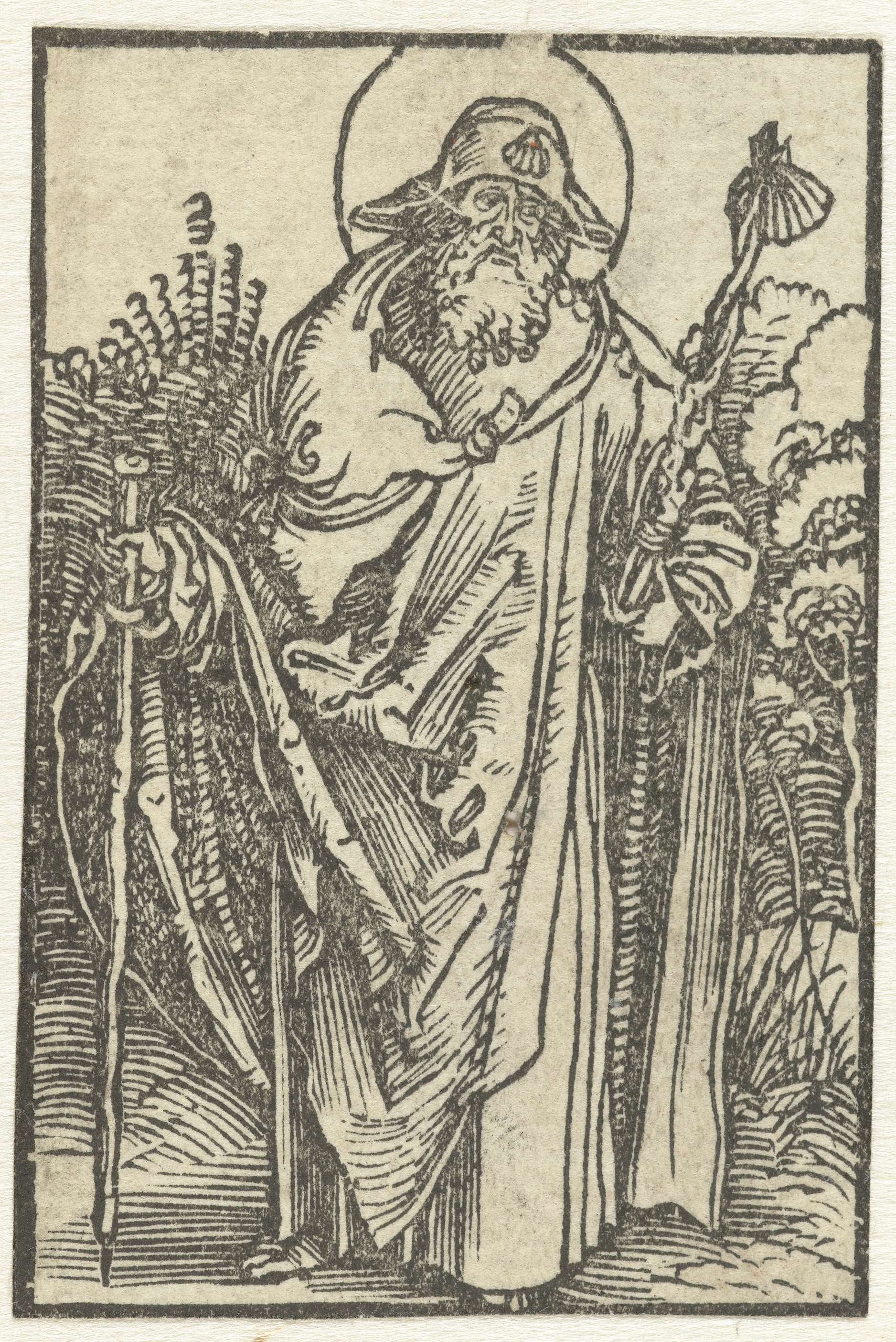 De apostel Jakobus de Meerdere met een hoed op het hoofd en een wandelstok in de hand.