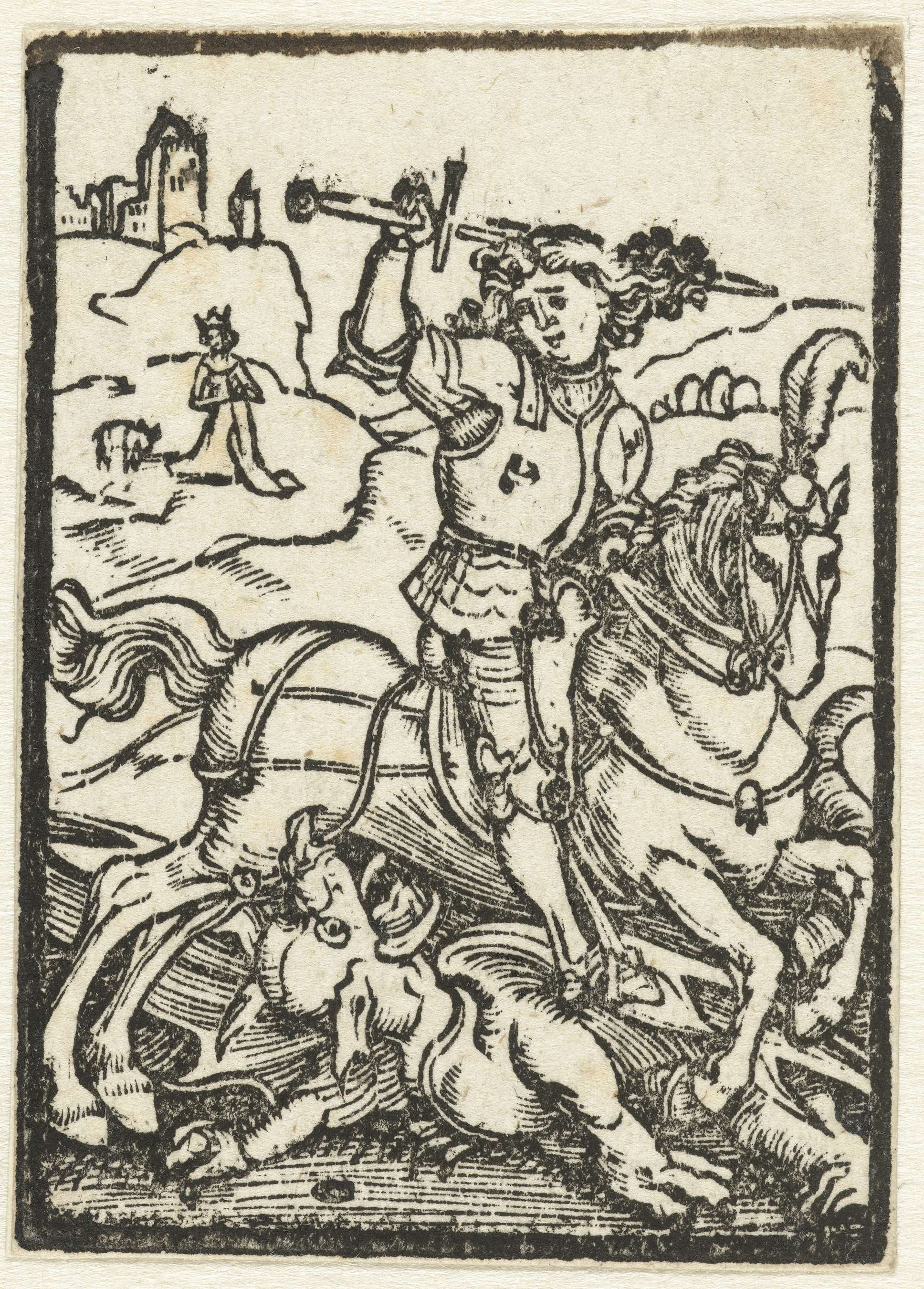De Heilige Joris vecht, gezeten op zijn paard, met zijn zwaard tegen een draak. Op de achtergrond een jonkvrouw.