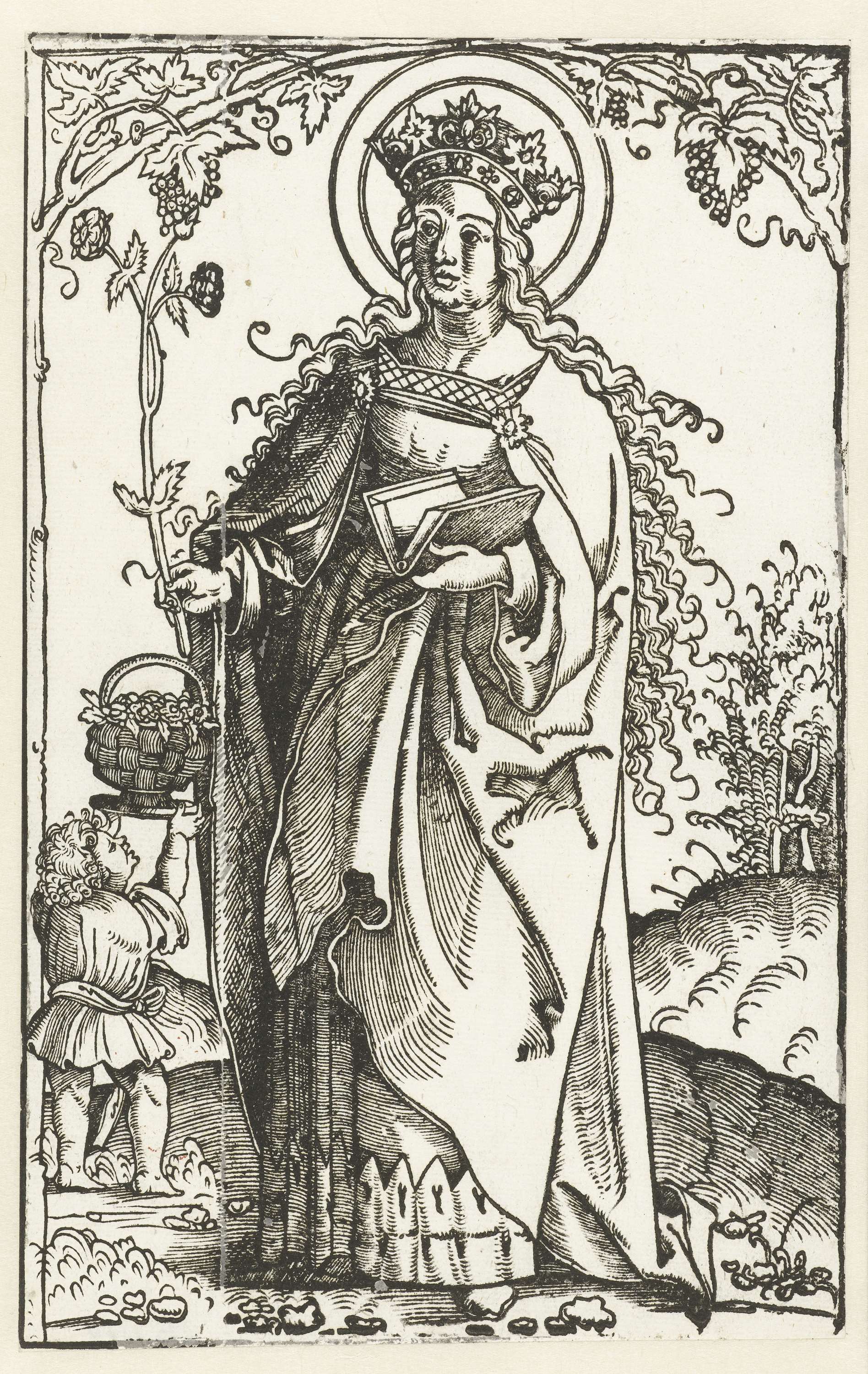 De Heilige Dorothea, ten voeten uit, een rozentak in de hand. Naast haar staat een kind, dat haar een mandje met rozen aanbiedt.