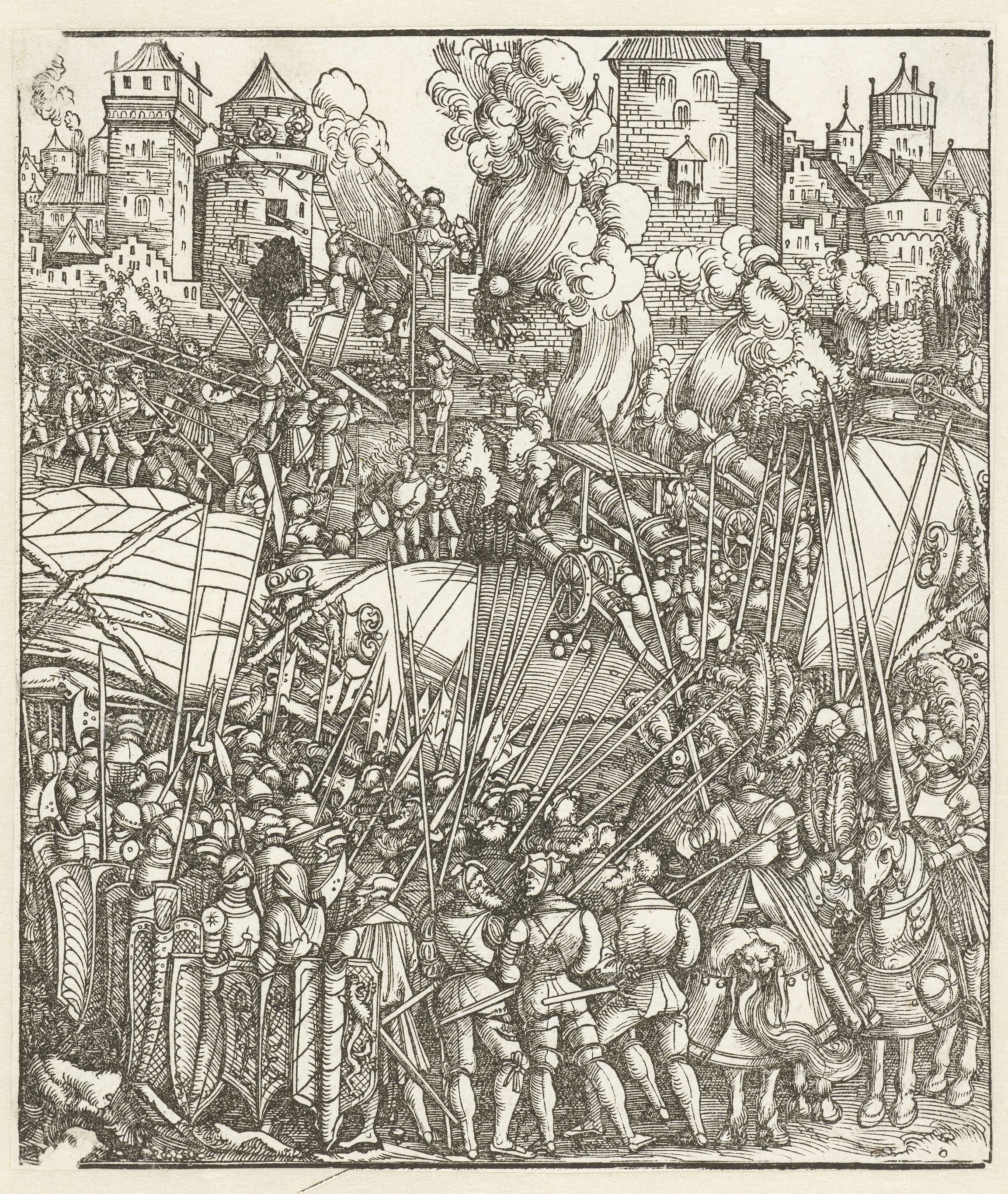 Een stad wordt zwaar onder vuur genomen en bestormd door de troepen van Maximiliaan. Detail van de triomfboog van keizer Maximiliaan I.