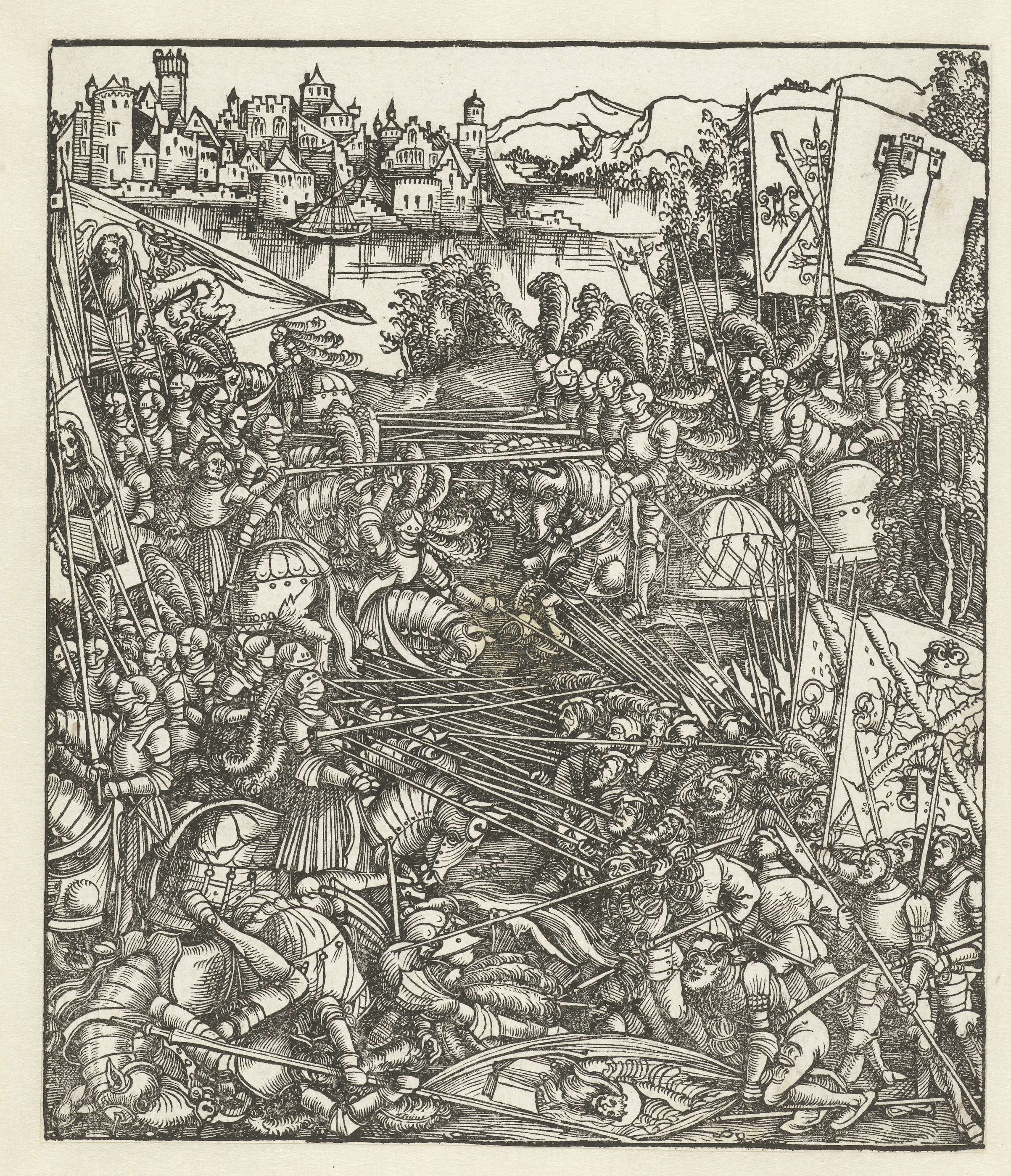 De troepen van Maximiliaan (rechts) vechten tegen de Venetiaanse troepen (links). Op de achtergrond de stad Venetië aan een baai. Detail van de triomfboog van keizer Maximiliaan I.