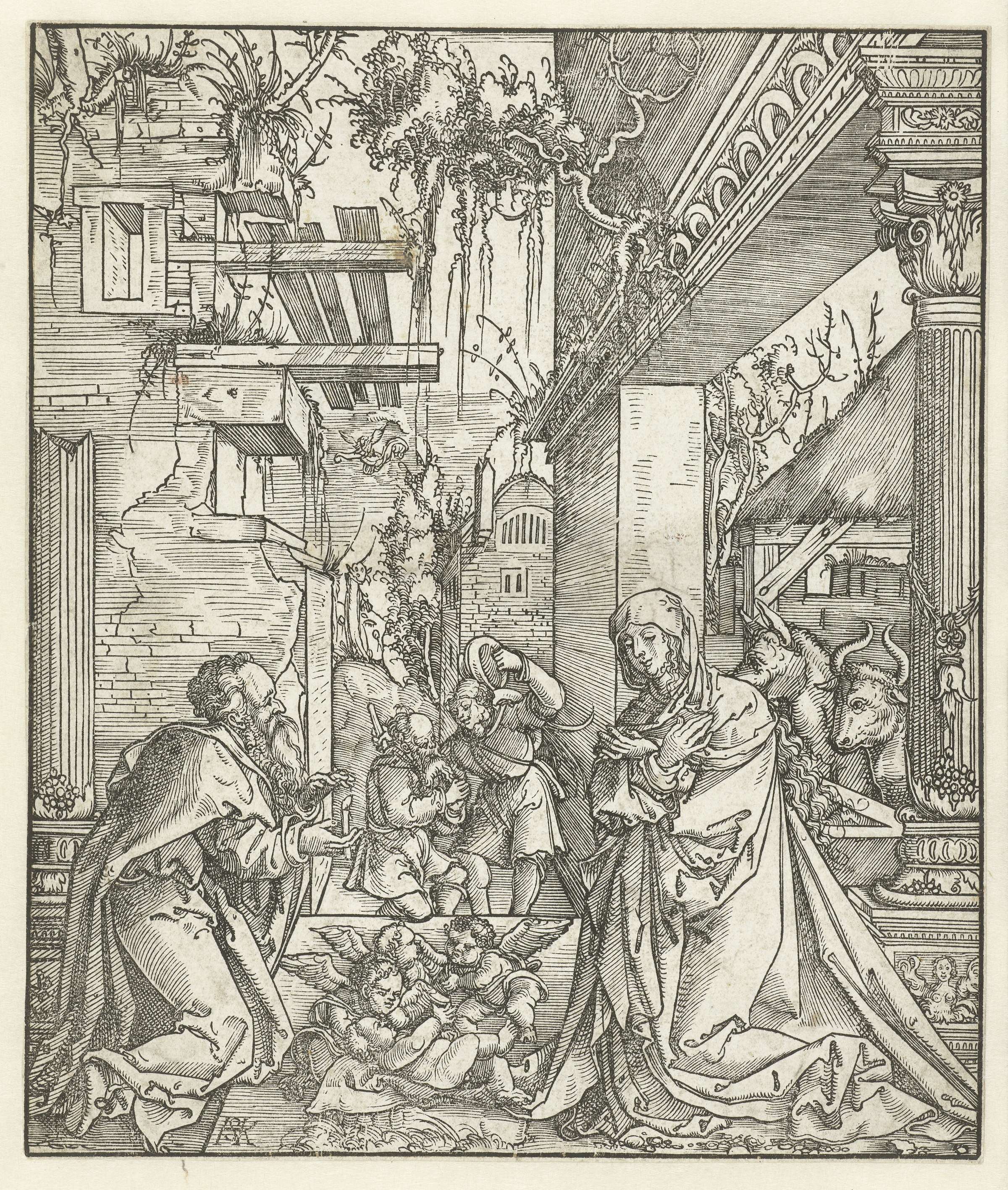 Maria en Jozef aanbidden geknield het Christuskind, dat tussen hen in in een bouwvallige ruimte ligt. Achter hen komen enkele herders binnen. Op de achtergrond rechts de os en de ezel.