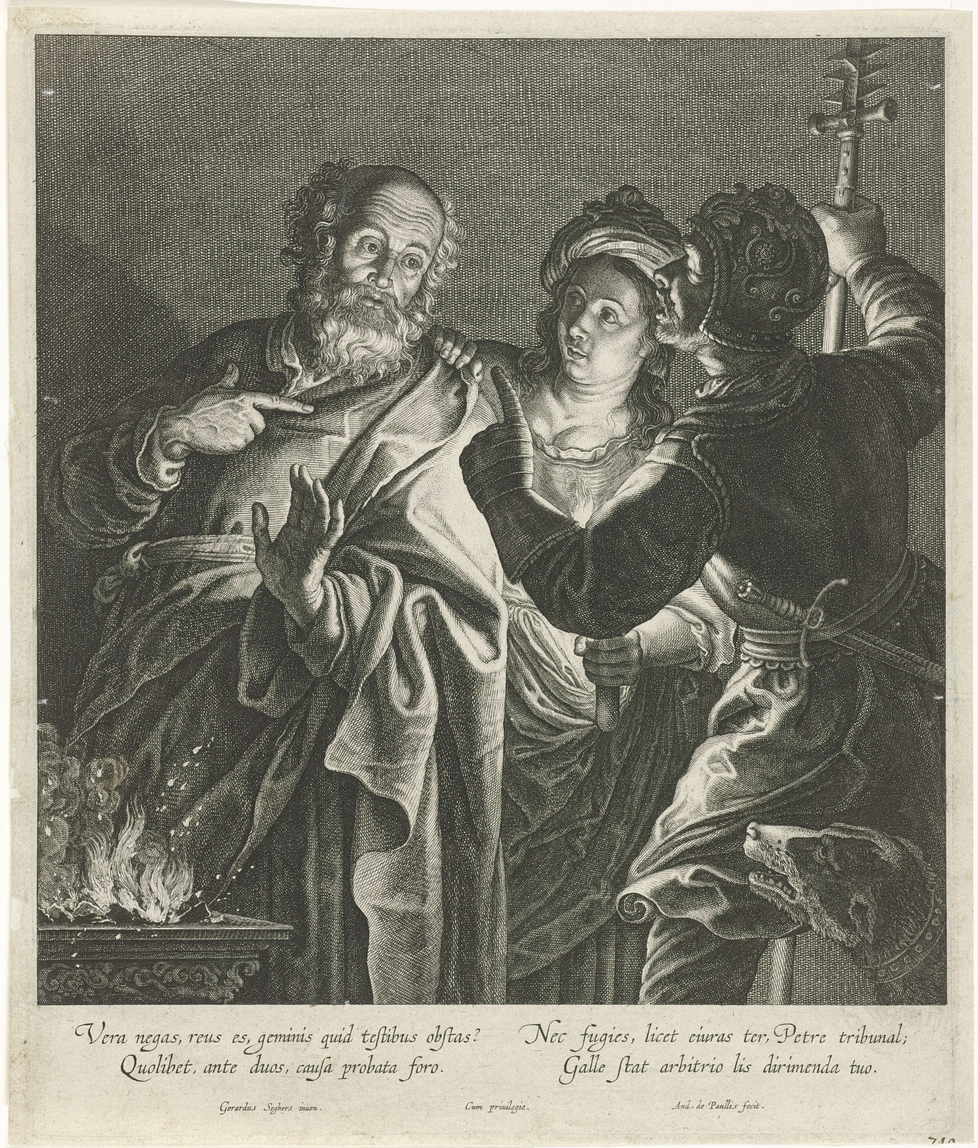 Een dienares van Kajafas herkent Petrus als volgeling van Christus, maar Petrus ontkent dit. In de marge een vierregelig onderschrift, in twee kolommen, in het Latijn.