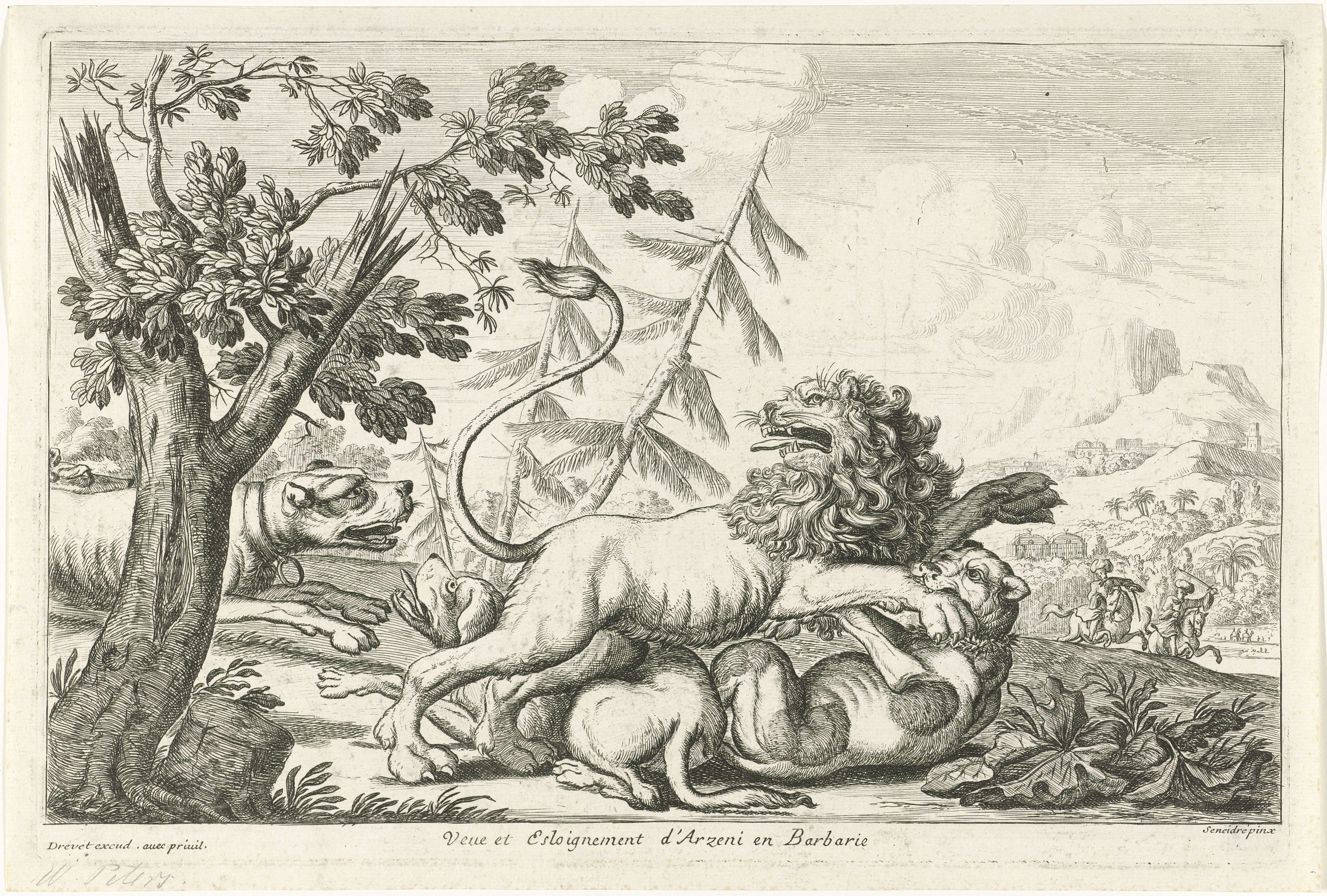 Landschap met een leeuwenjacht. Rechts op de achtergrond een gezicht op Arzeni (Arzeou), op het eiland Barbados. In de marge een onderschrift in het Frans.