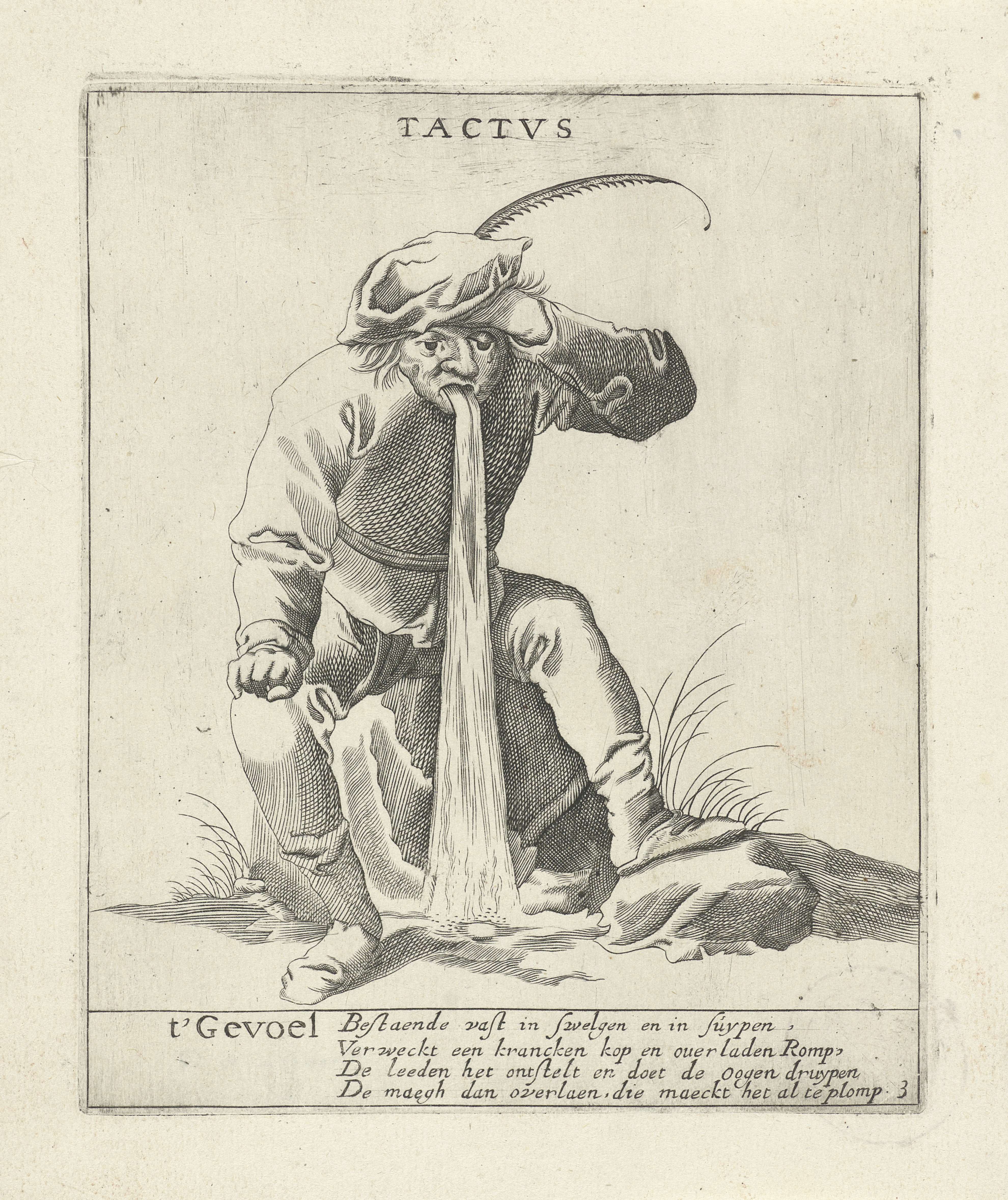 Een man, met een hoed met veer op het hoofd, zit een beetje voorovergebogen op een steen en braakt op de grond. Onder de afbeelding een stichtend vers over de consequenties van overmatig eten en drinken. De prent maakt deel uit van een serie van vijf prenten met de vijf zintuigen.