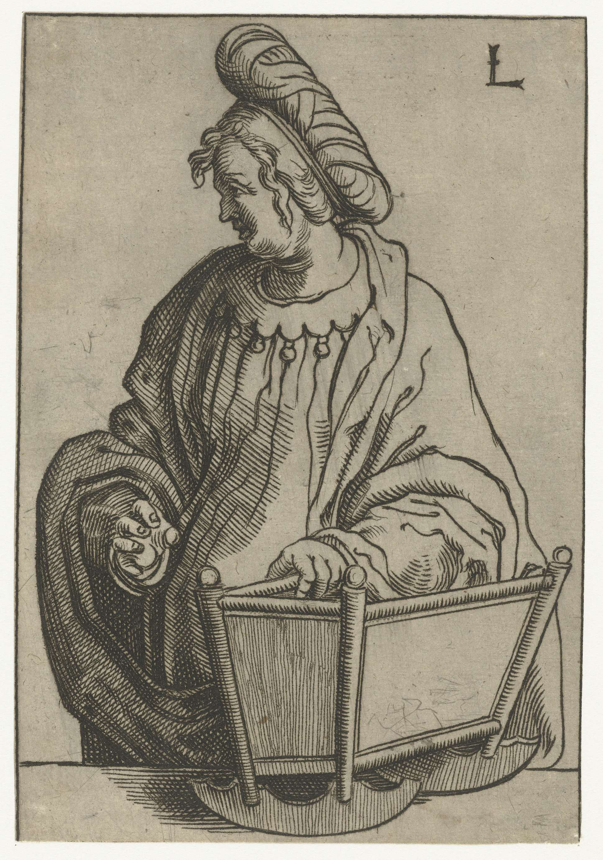 Kopie van houtsnede, in spiegelbeeld. Sibylle van het orakel op het eiland Samos, met wieg.