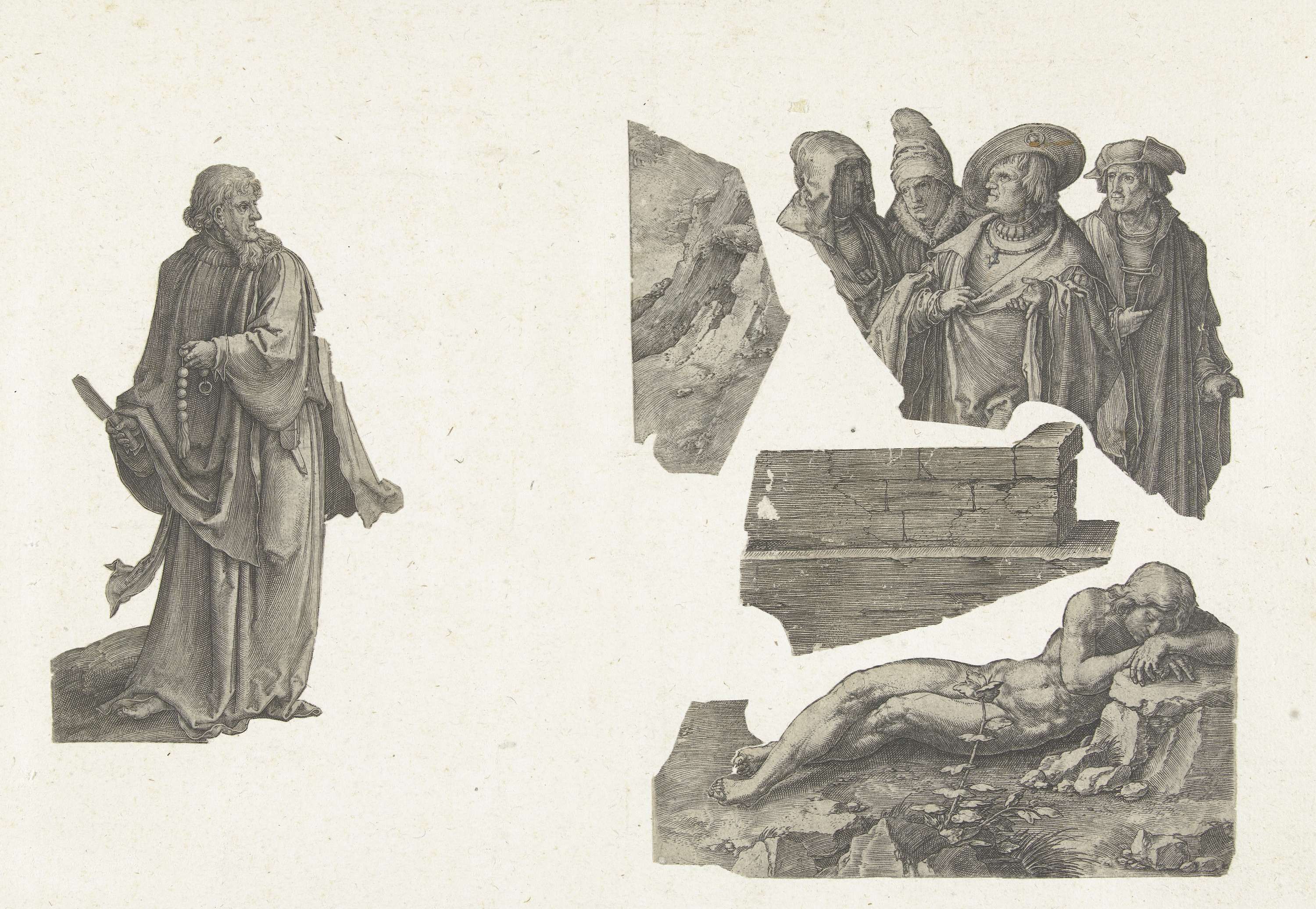 Eén fragment van vijf op blad. Slapende Adam, uit "De schepping van Eva", langs contour uitgeknipt.