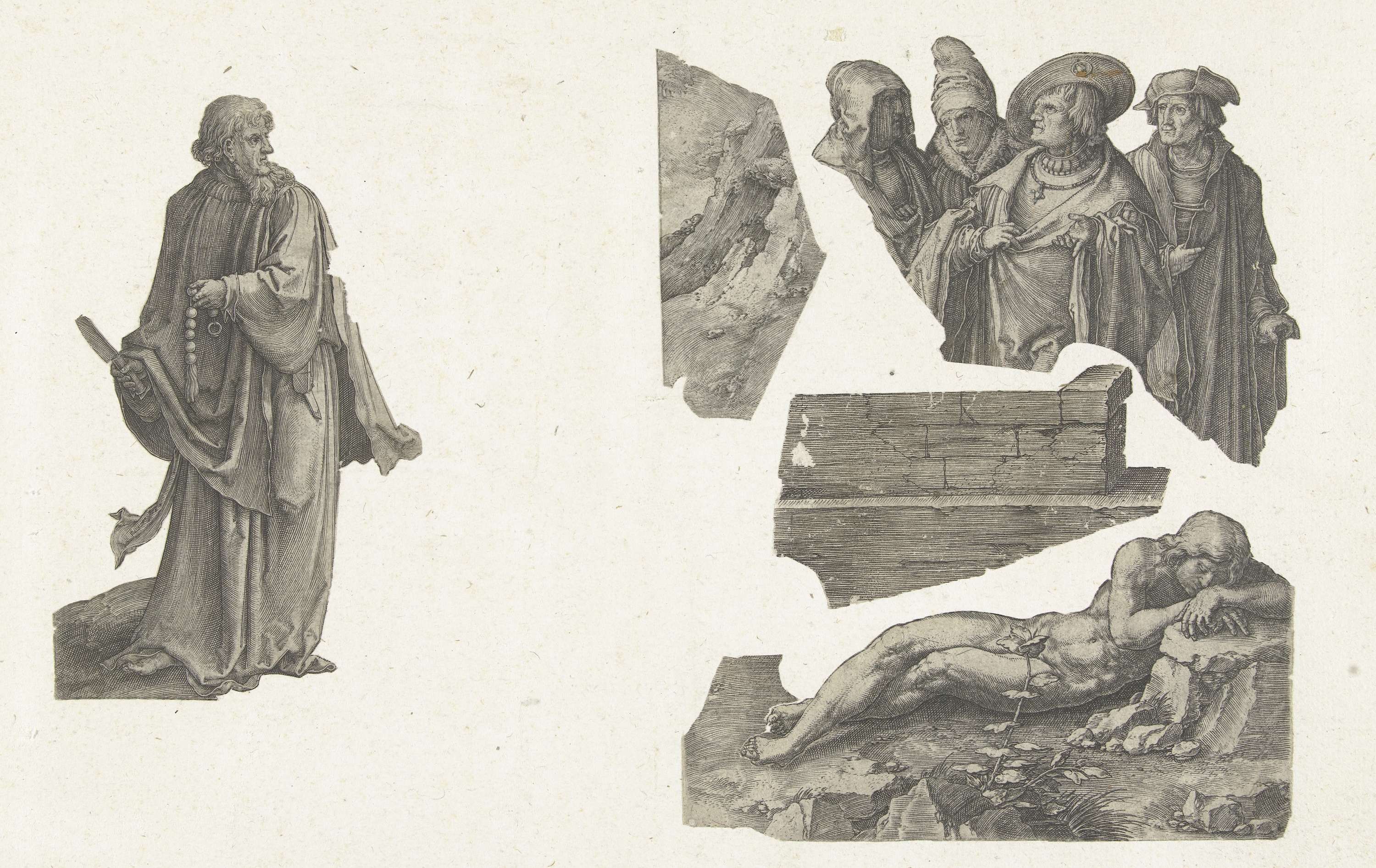 Eén fragment van vijf op blad. Een fragment van een rots uit "Abraham zendt Hagar weg", langs contour uitgeknipt.