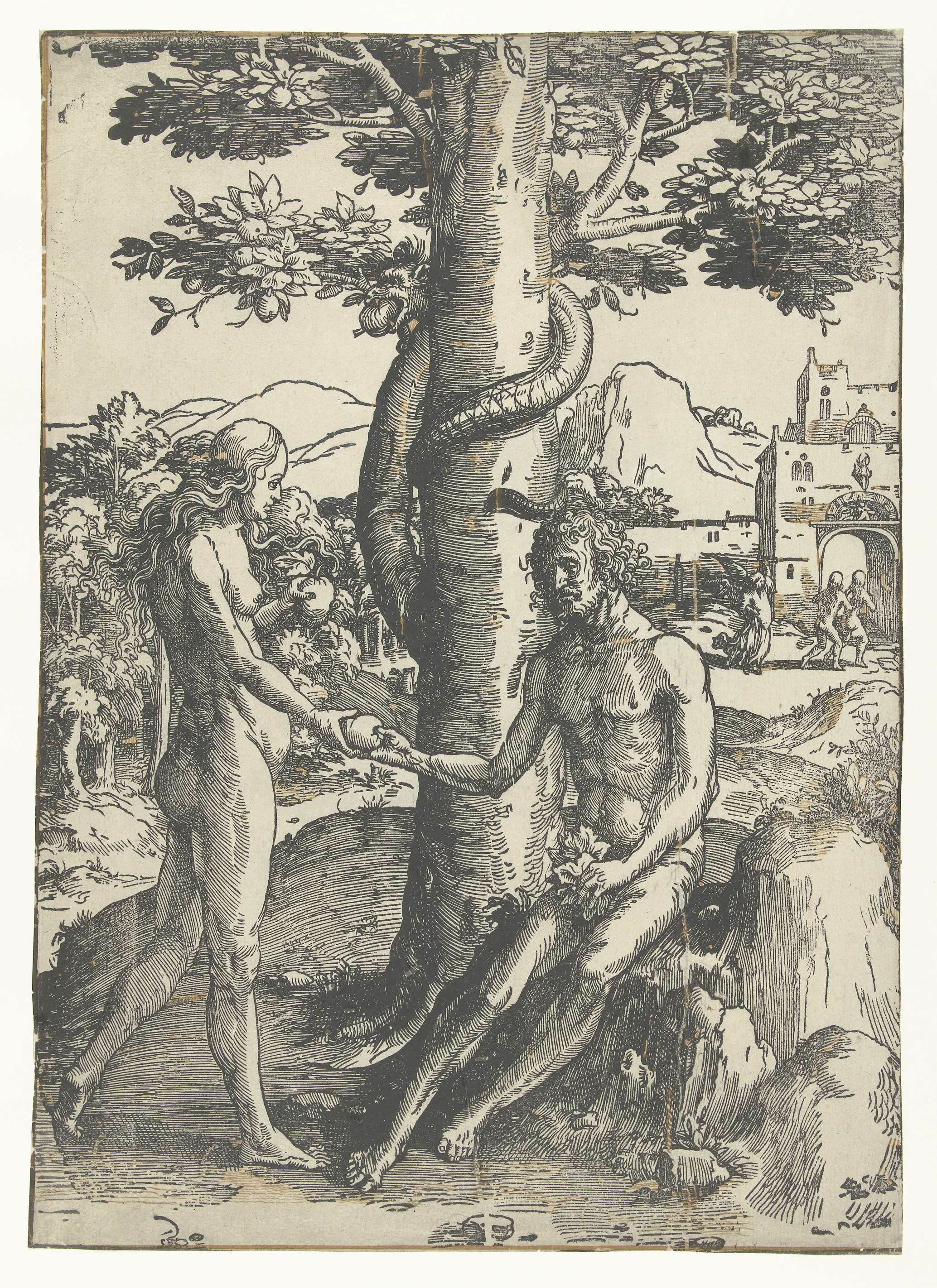 Eva overhandigt Adam de verboden vrucht. Rechts op de achtergrond de verdrijving uit het Paradijs.
