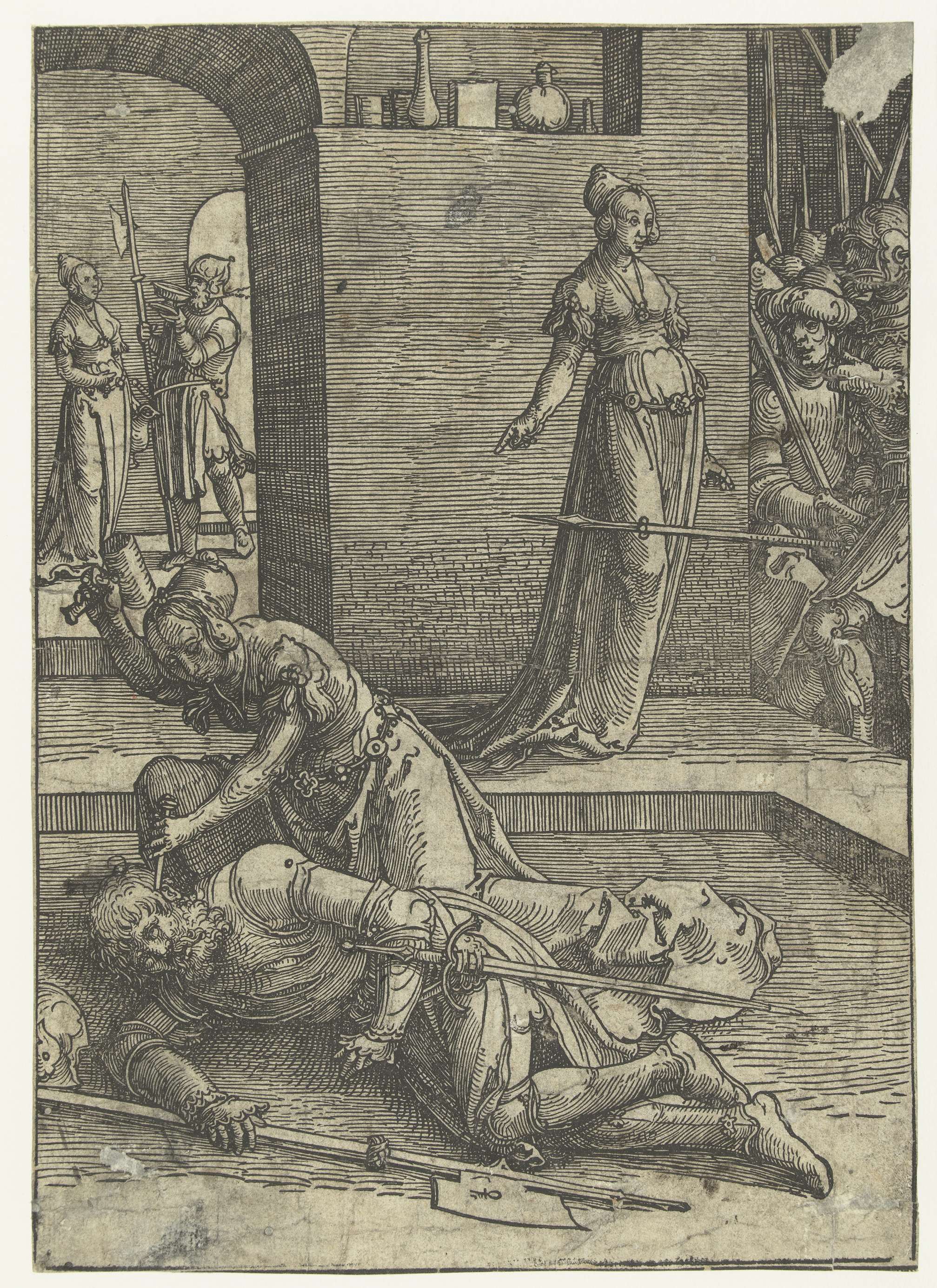 Drie scènes uit het verhaal van Jaël. Links: Jaël geeft Sisera te drinken. Midden: Jaël doodt slapende Sisera door tentpin door zijn hoofd te slaan. Rechts: Jaël toont Berak en zijn mannen waar zij Sisera kunnen vinden.