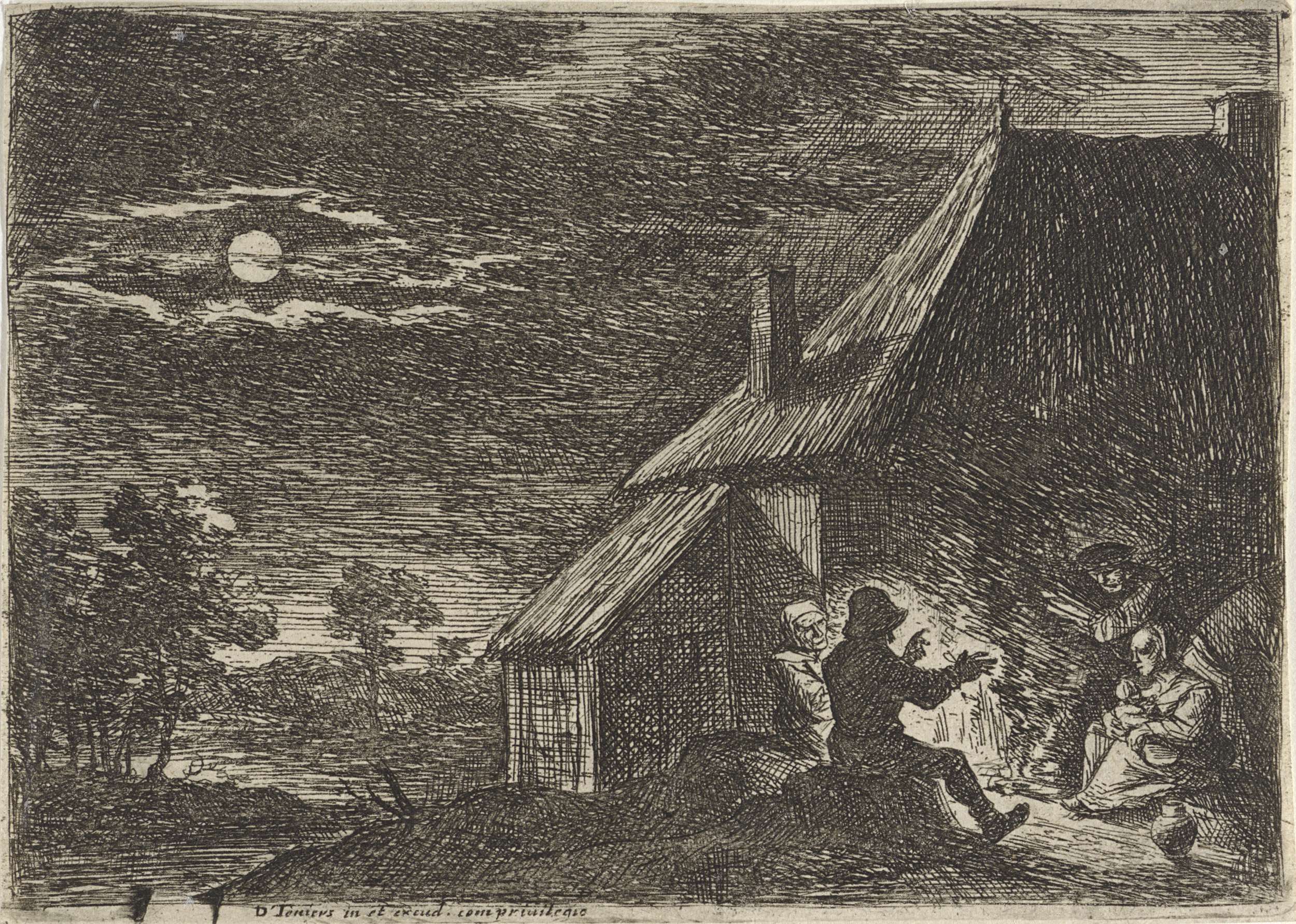 Boeren naast een boerderij bij een vuur. Aan de hemel schijnt de maan.