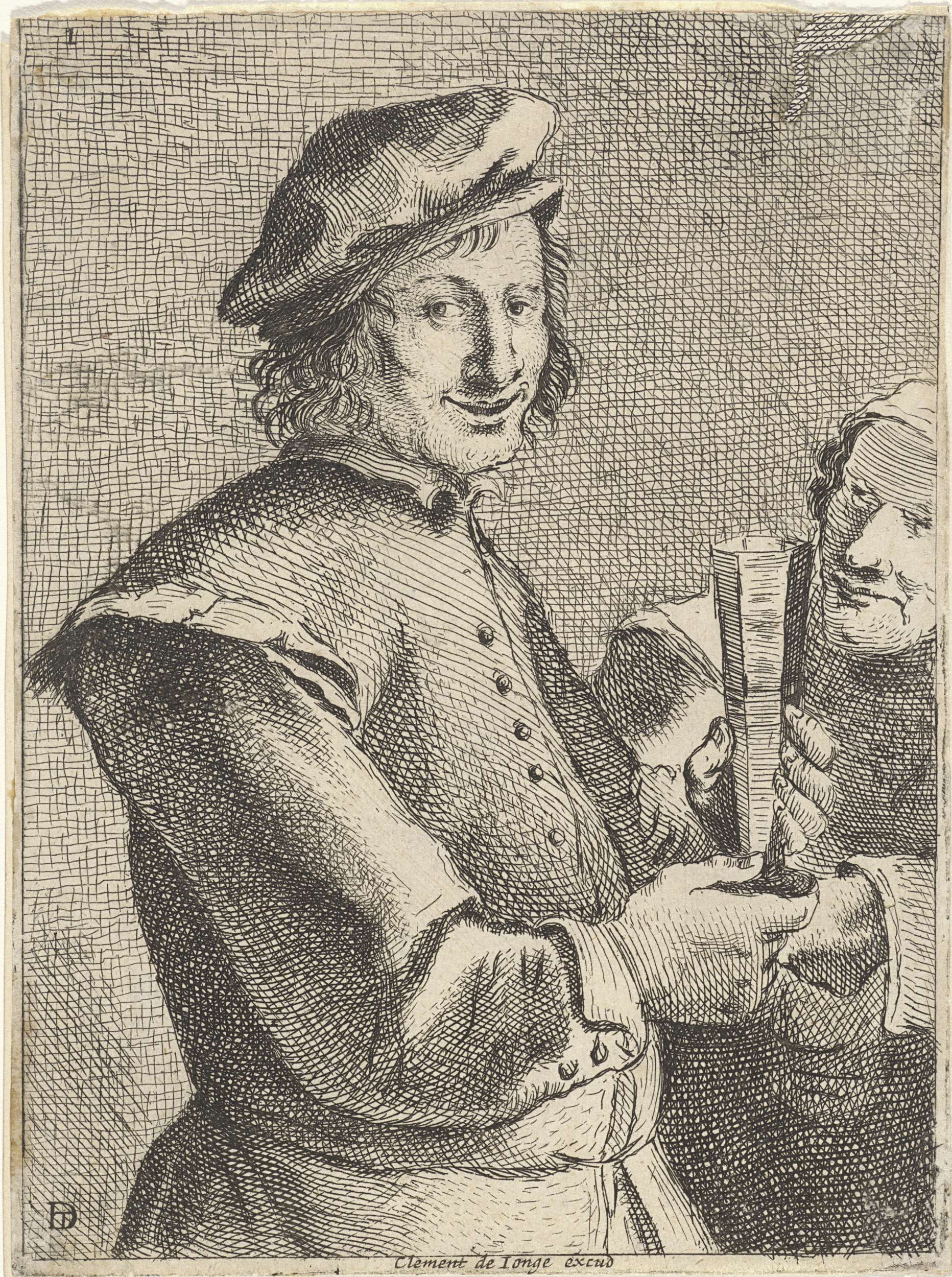 Staande man met een glas in zijn handen. De vrouw rechts lijkt het glas aan te geven.