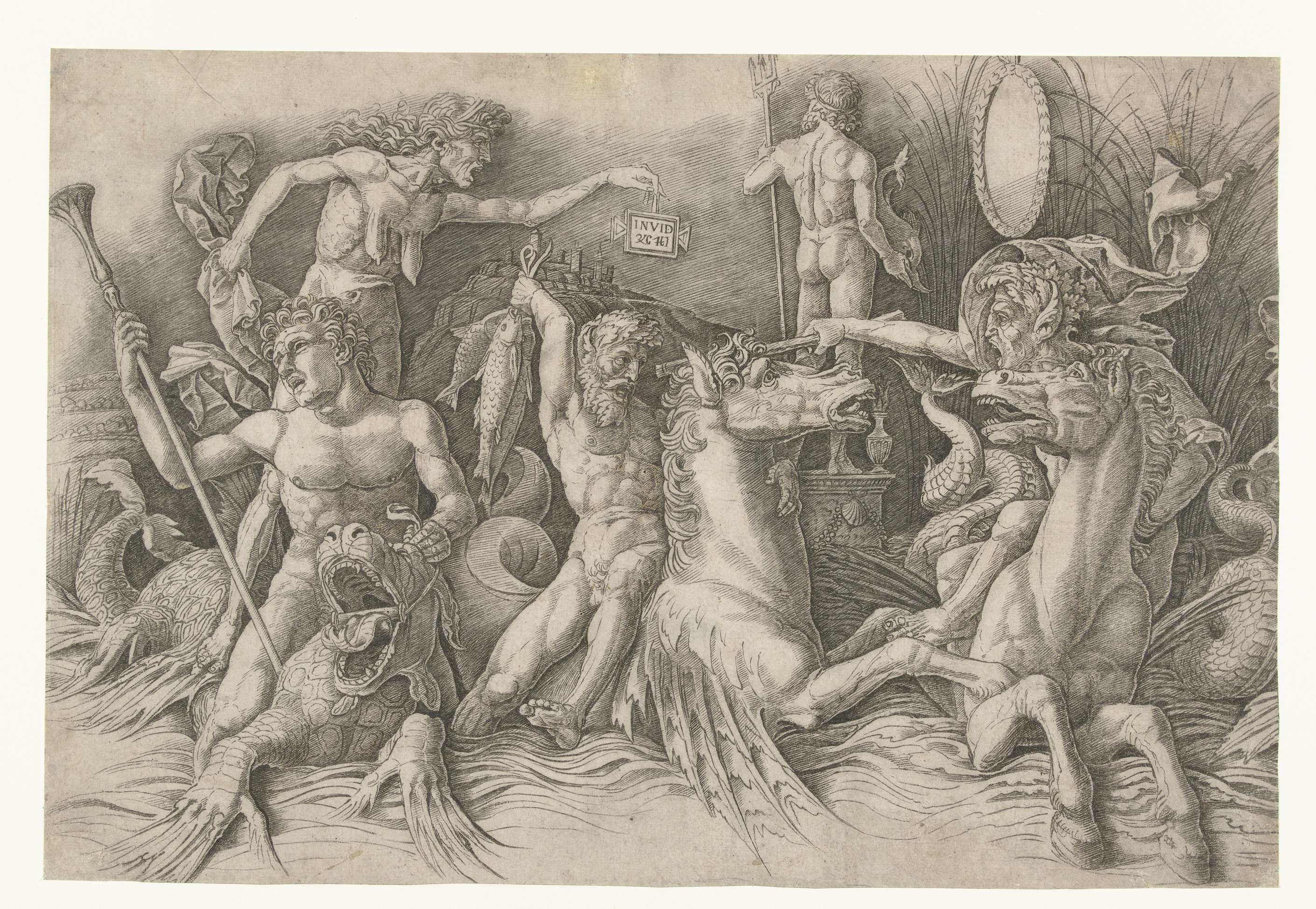 Andrea Mantegna maakte als eerste Italiaanse schilder prenten om zijn gedurfde ontwerpen overal te kunnen verspreiden. De afbeelding met zeegoden is de linkerhelft van een fries (lange verhalende voorstelling) en is geïnspireerd op een antiek reliëf. Hiervan maakte Mantegna een fantastisch gevecht van goden en monsters, aangemoedigd door de Afgunst (Invidia), neergezet als naakte, oude ...
