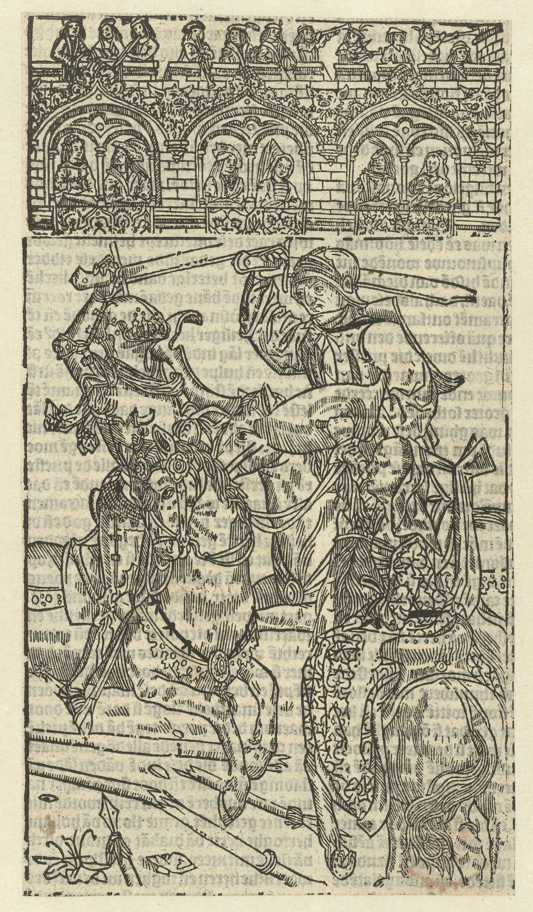 Blad bedrukt met twee blokken boven elkaar. Bovenste: toeschouwers kijken vanuit een gebouw, op het gebouw musicerende figuren. Onderste: twee ridders te paard vechtend met zwaarden. Vrouw te paard houdt een schild omhoog.