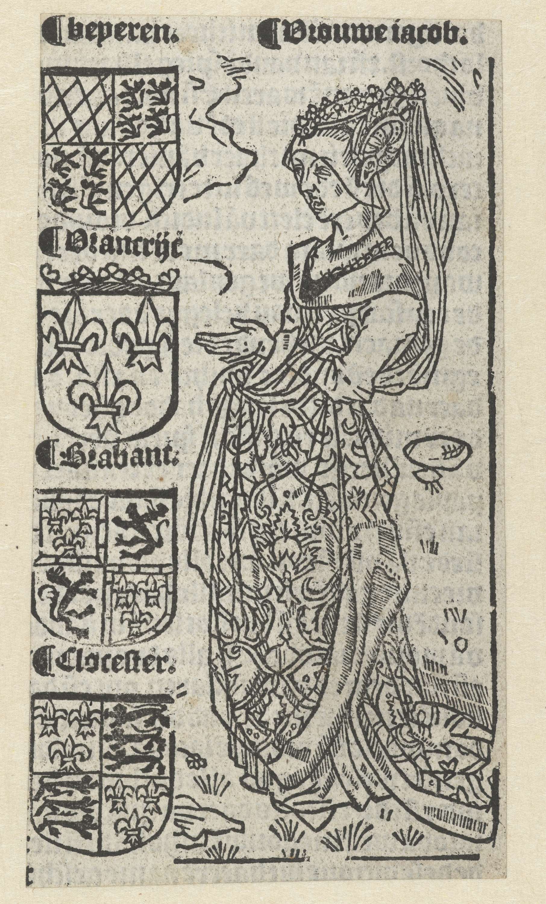 Jacoba ten voeten uit met wapenschilden van Beieren, Frankrijk, Brabant en Gloucester,
