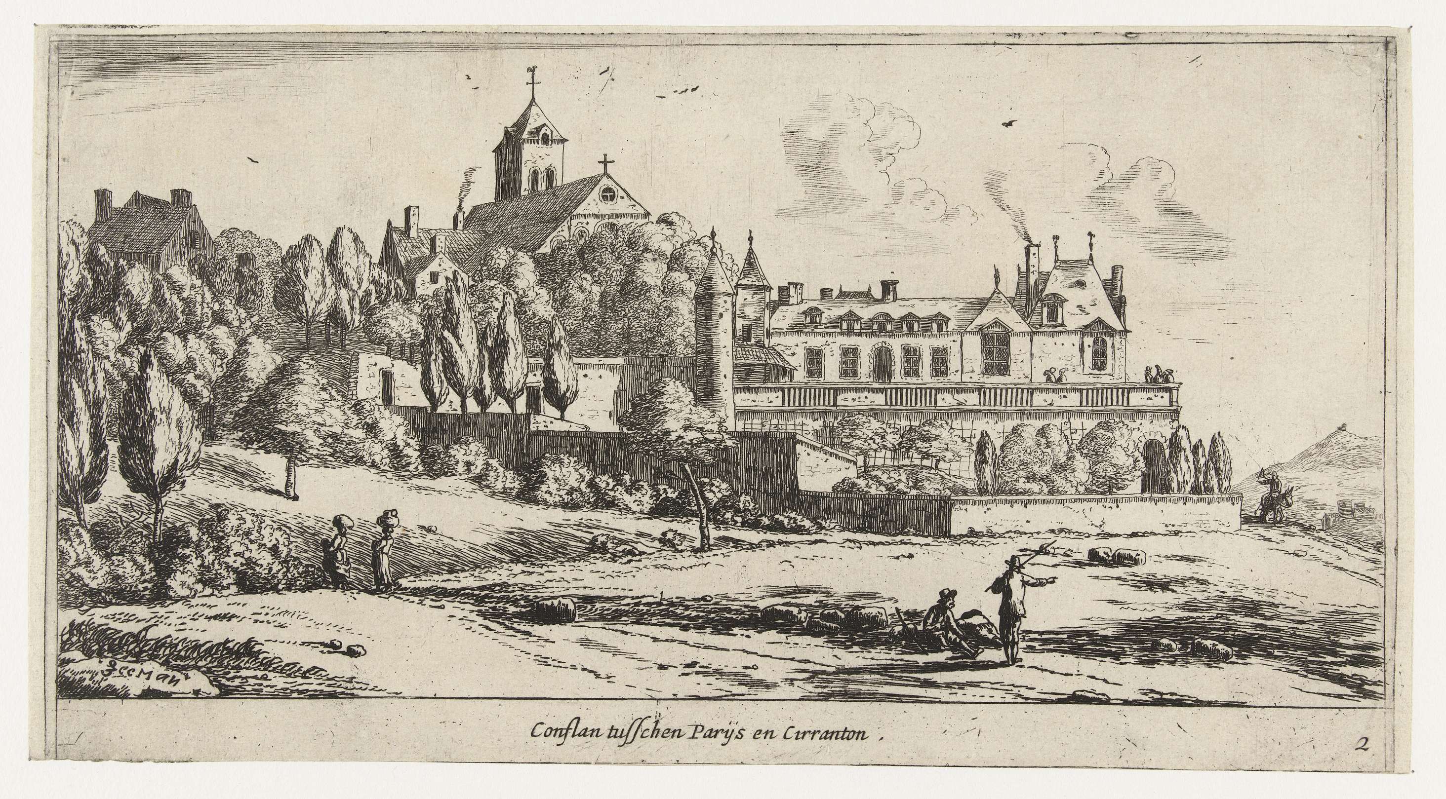 Gezicht op Conflans, een ommuurd dorp met een kerk in een heuvelig landschap. Twee herders met een kudde schapen en twee vrouwen met manden wandelend in het landschap.