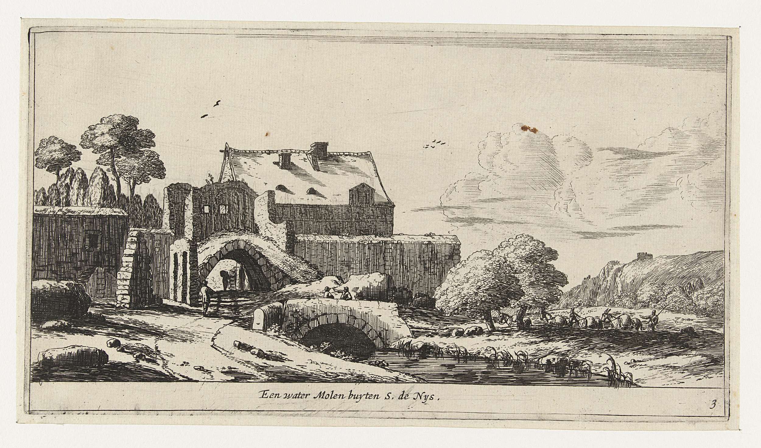 Een watermolen bij Saint-Denis. Langs de beek een man met een aantal ezels.