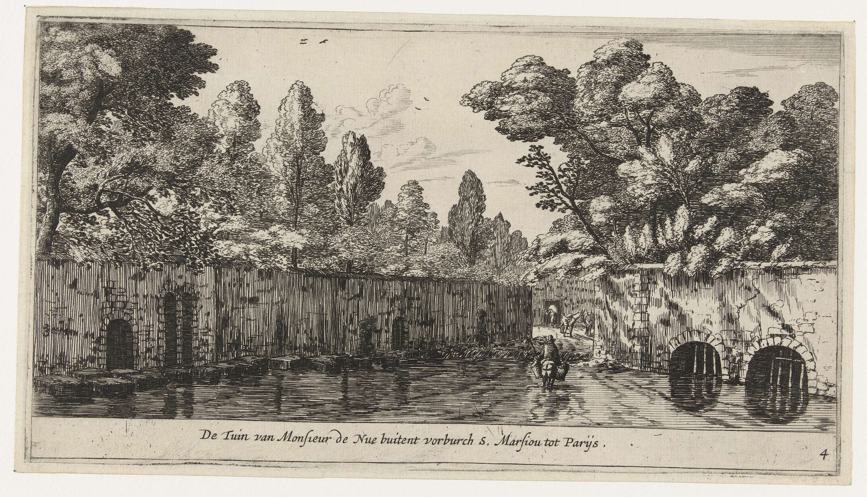 Ommuurde tuin van Monsieur de Nue buiten de Parijse voorstad Marsiou. Tussen de muren een ondergelopen straat met een aantal mensen.