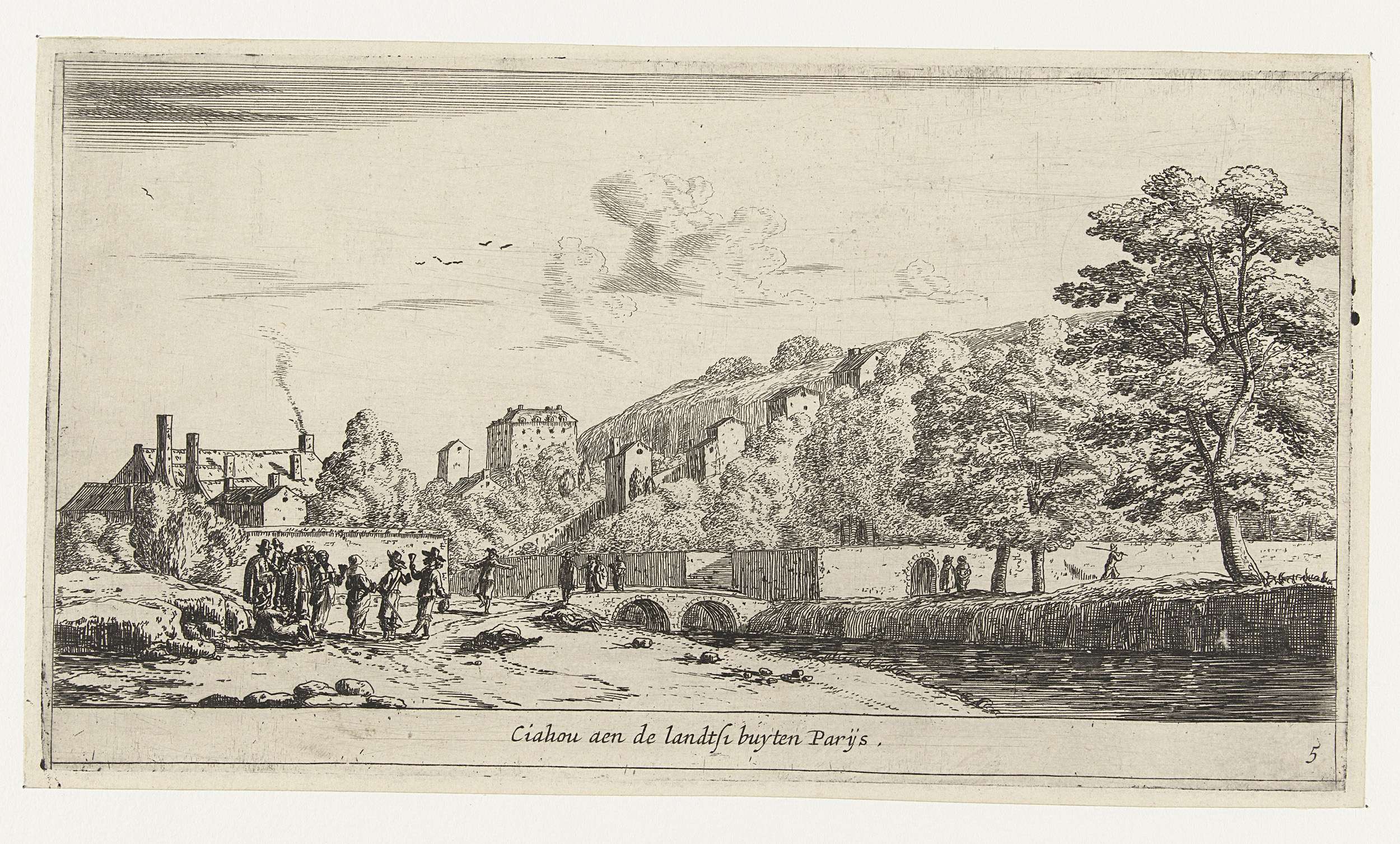 Gezicht op het dorp Chaillot aan de rivier, net buiten Parijs. Op de oever komen een aantal personen bijeen.