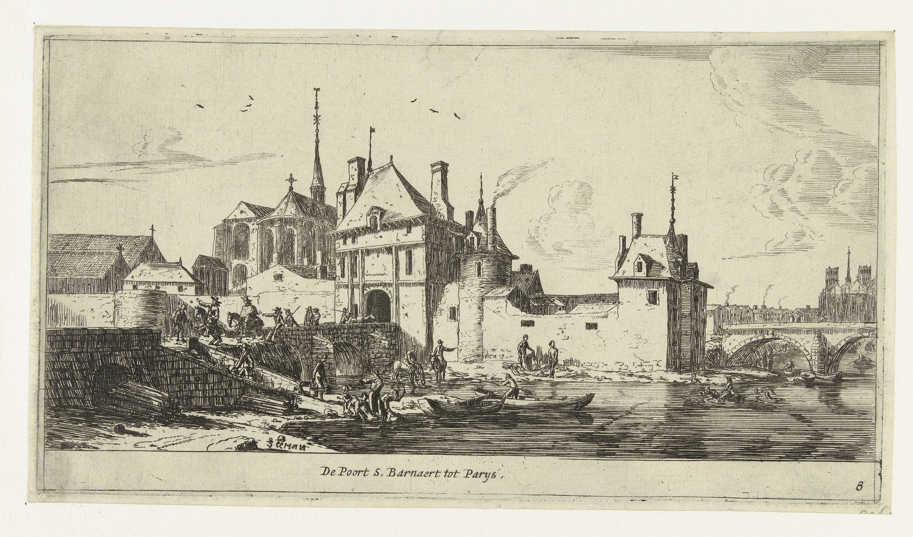 De stadspoort van St. Bernard te Parijs aan de Seine. Achter de stadsmuur een grote kerk zichtbaar.