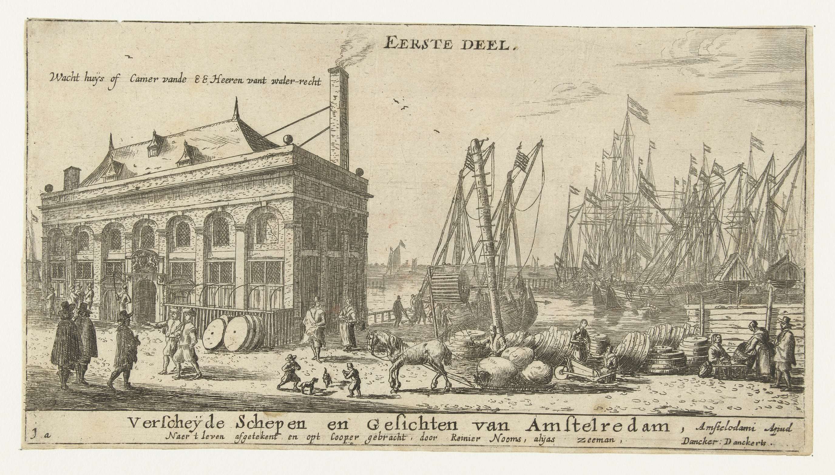 Titelblad van een serie schepen en stadsgezichten. De kamer van de heren van het waterrecht op het Kamperhoofd en de Slijpstenenmarkt bij de haven. Rechts liggen de slijpstenen op de kade, daar achter zeilschepen. Tegenwoordig de Prins Hendrikkade.