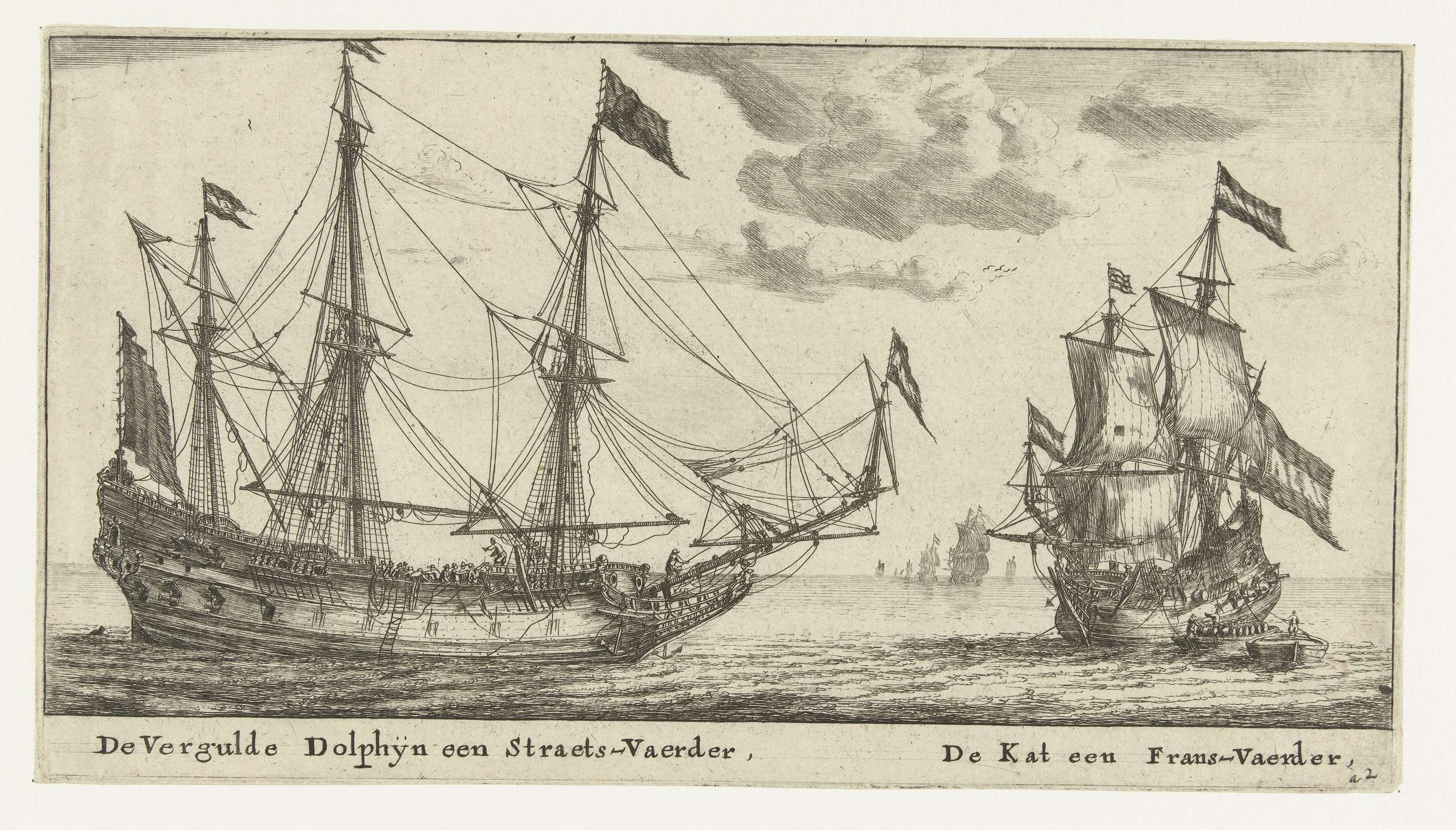 De Vergulde Dolphijn, een groot koopvaardijschip varend op de Straat van Gibraltar, en De Kat, een koopvaardijschip varend op Frankrijk.