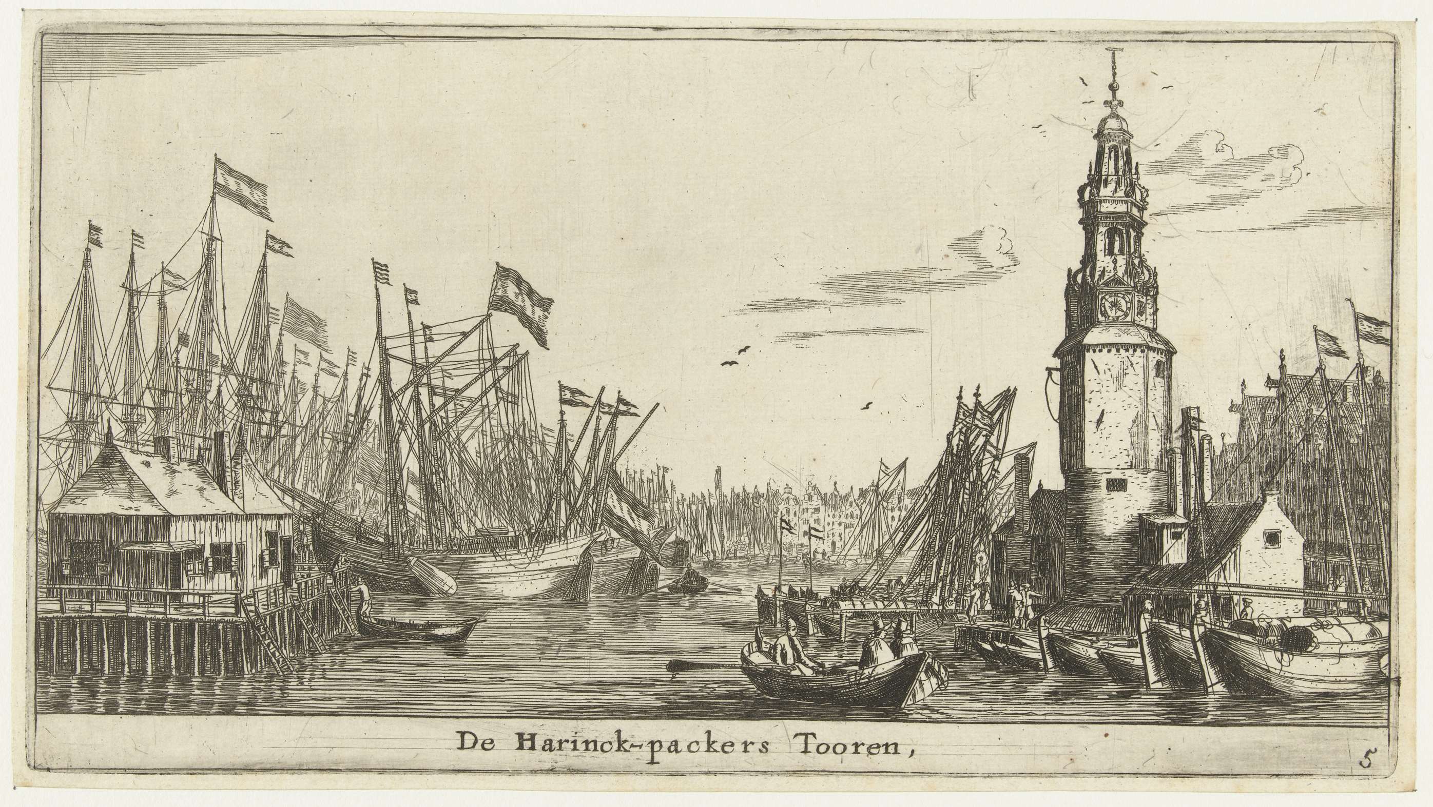 Havenfront met vele aangemeerde zeilschepen. Links de oude Stadsherberg, rechts de Haringpakkerstoren en de huizen aan de Haringpakkerij, tegenwoordig de Prins Hendrikkade.