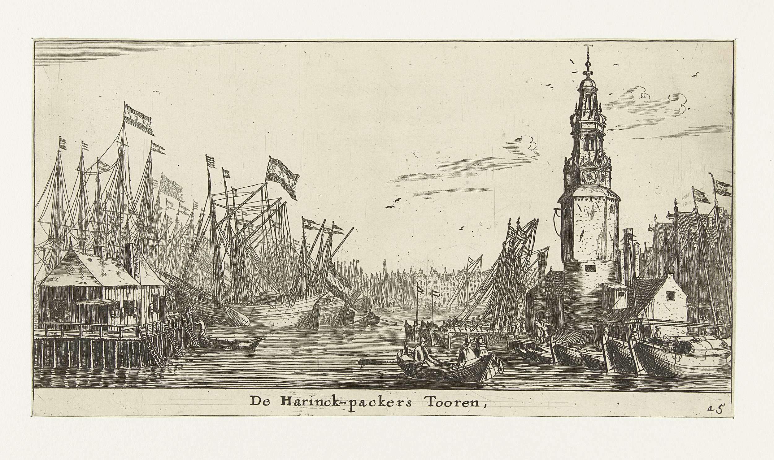 Havenfront met vele aangemeerde zeilschepen. Links de oude Stadsherberg, rechts de Haringpakkerstoren en de huizen aan de Haringpakkerij, tegenwoordig de Prins Hendrikkade.