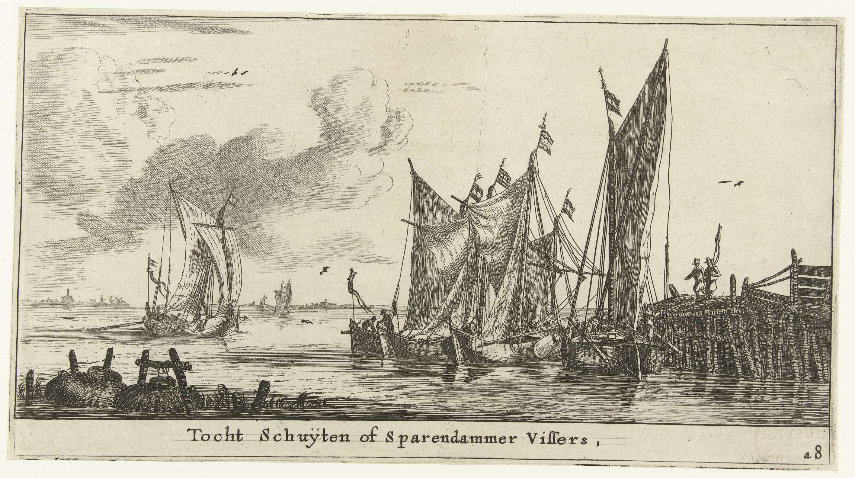 Aantal tochtschuiten of ook wel Spaarndamse vissersboten, bij een houten pier.